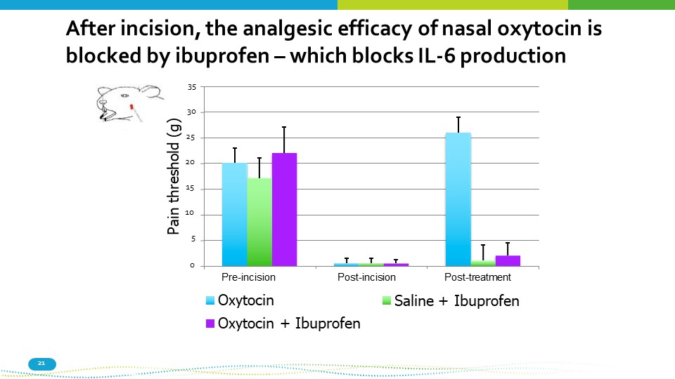0 35 30 25 20 15 10 5 1 2 3 Pain threshold (g) Saline + Ibuprofen After incision, the analgesic efficacy of nasal oxytocin is blocked by ibuprofen – which blocks IL - 6 production Pre - incision Post - incision Oxytocin Oxytocin + Ibuprofen 21 Post - treatment