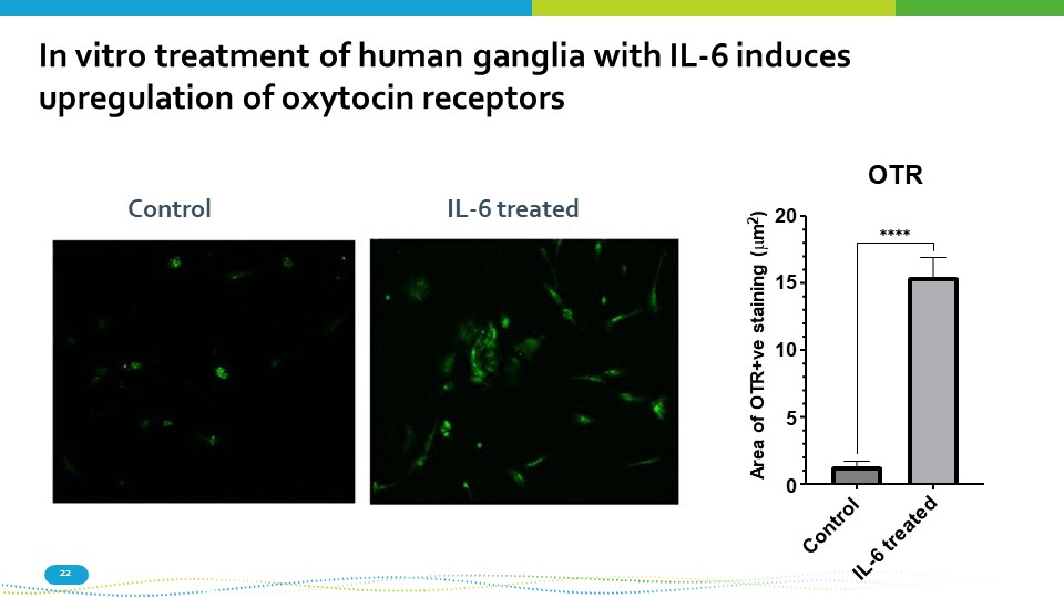 15 10 5 0 20 OTR Area of OTR+ve staining (  m 2 ) ٓٓٓٓ In vitro treatment of human ganglia with IL - 6 induces upregulation of oxytocin receptors Control 22 IL - 6 treated