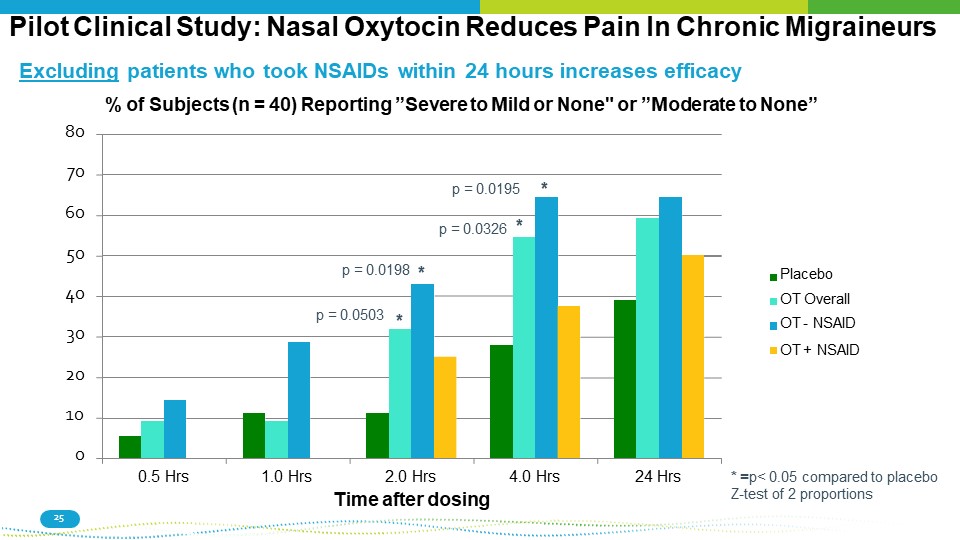 Pilot Clinical Study: Nasal Oxytocin Reduces Pain In Chronic Migraineurs * = p< 0.05 compared to placebo Z - test of 2 proportions 20 10 0 30 40 50 60 0.5 Hrs 1.0 Hrs 2.0 Hrs Time after dosing 4.0 Hrs 24 Hrs Placebo OT Overall OT - NSAID OT + NSAID * 25 p = 0.0195 p = 0.0326 * * p = 0.0503 p = 0.0198 * Excluding patients who took NSAIDs within 24 hours increases efficacy % of Subjects (n = 40) Reporting ”Severe to Mild or None" or ”Moderate to None” 80 70