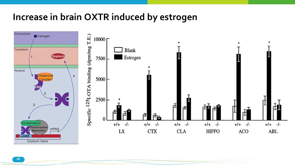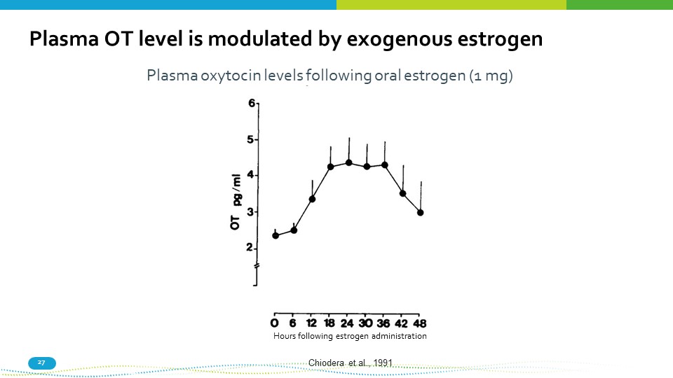 27 Plasma OT level is modulated by exogenous estrogen Chiodera et al., 1991 Plasma oxytocin levels following oral estrogen (1 mg) Hours following estrogen administration