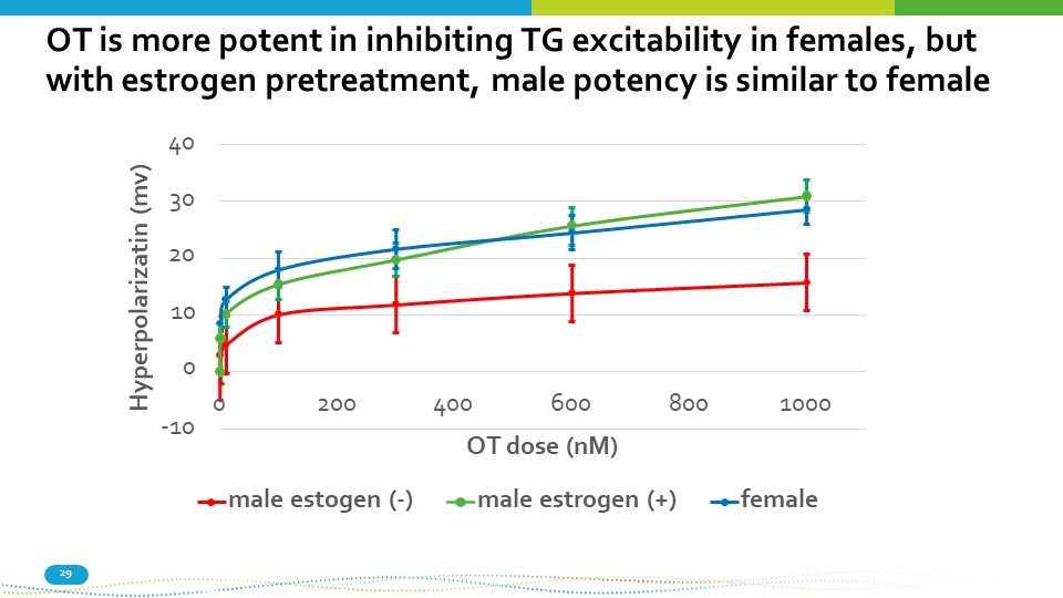 OT is more potent in inhibiting TG excitability in females, but with estrogen pretreatment, male potency is similar to female - 10 40 30 20 10 0 0 200 800 1000 400 600 OT dose (nM) Hyperpolarizatin (mv) male estogen ( - ) male estrogen (+) female 29