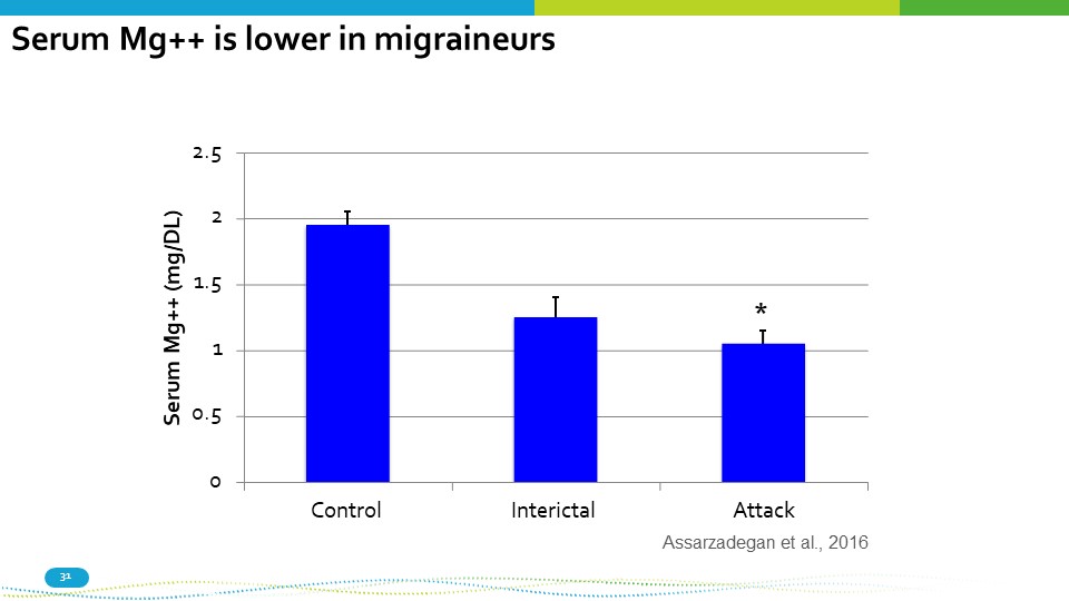 Attack Assarzadegan et al., 2016 31 0 1 0.5 2.5 2 1.5 Control Interictal Serum Mg++ (mg/DL) * Serum Mg++ is lower in migraineurs