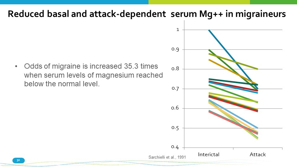 Reduced basal and attack - dependent serum Mg++ in migraineurs Sarchielli et al., 1991 0.6 0.5 0.4 32 0.7 0.8 1 0.9 Interictal Attack • Odds of migraine is increased 35.3 times when serum levels of magnesium reached below the normal level.