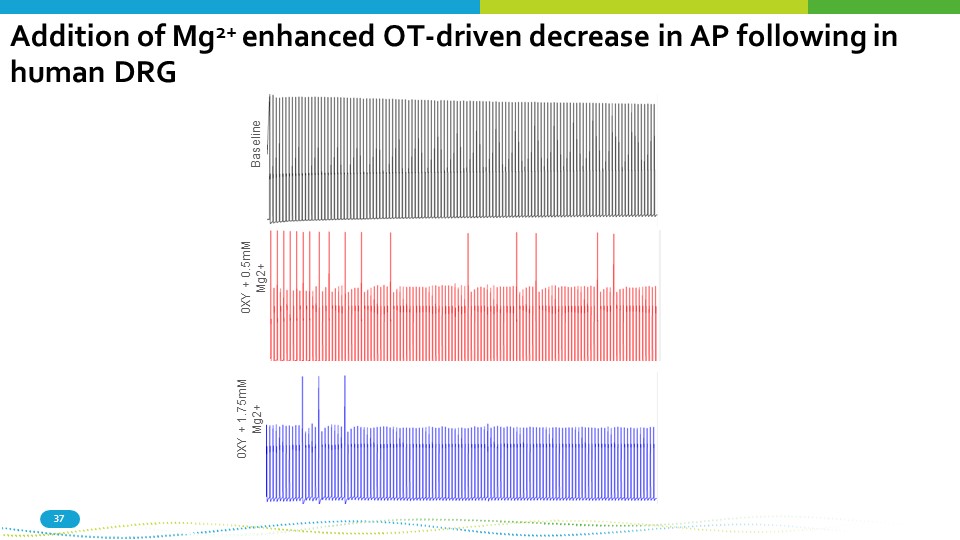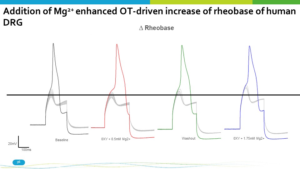 0XY + 0.5mM Mg2+ 0XY + 1.75mM Mg2+ Washout Baseline 20mV 100ms ∆ Rheobase Addition of Mg 2+ enhanced OT - driven increase of rheobase of human 36 DRG