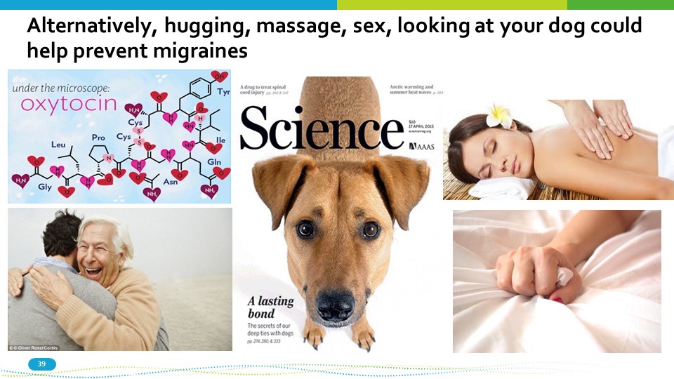 Alternatively, hugging, massage, sex, looking at your dog could help prevent migraines 39