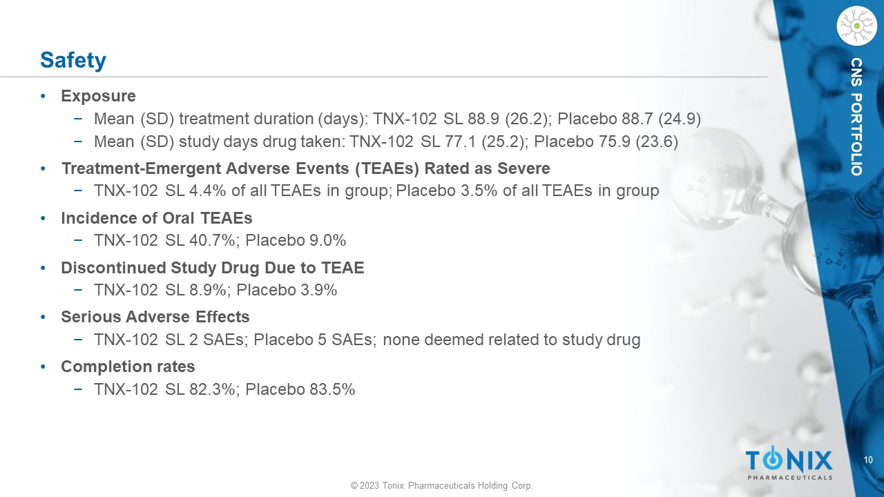 9 © 2023 Tonix Pharmaceuticals Holding Corp. CNS PORTFOLIO Key Secondary Efficacy Endpoint Analyses • Sequential test procedure to adjust for multiplicity applied to primary and key secondary endpoints; hierarchy of key secondaries: • PGIC , responder analysis, proportion with ‘2’ or ‘1’ at Week 14 • FIQR Symptoms domain, change from baseline at Week 14 • FIQR Function domain, change from baseline at Week 14 • PROMIS Sleep Disturbance (8a), change from baseline at Week 14 • PROMIS Fatigue (8a), change from baseline at Week 14 • Sleep Quality by daily diary, change from baseline at Week 14 TNX - 102 SL was not associated with significant improvement in PGIC at week 14 but was associated with improvements in FIQR, PROMIS, and daily sleep quality. FIQR = Fibromyalgia Impact Questionnaire – Revised; PGIC = Patient Global Impression of Change (‘2’ = much improved; ‘1’ = very much improved); PROMIS = Patient - Reported Outcomes Measurement Information System