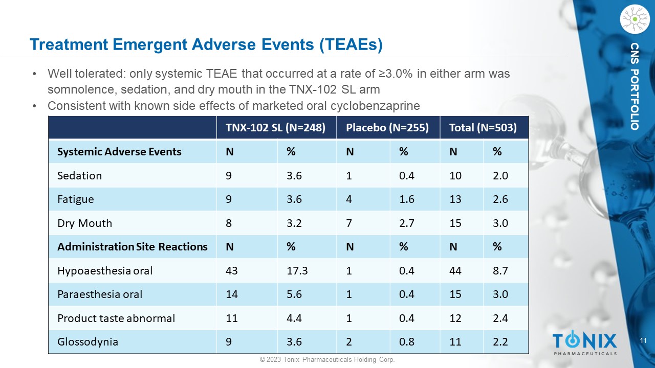 10 © 2023 Tonix Pharmaceuticals Holding Corp. CNS PORTFOLIO Safety • Exposure − Mean (SD) treatment duration (days): TNX - 102 SL 88.9 (26.2); Placebo 88.7 (24.9) − Mean (SD) study days drug taken: TNX - 102 SL 77.1 (25.2); Placebo 75.9 (23.6) • Treatment - Emergent Adverse Events (TEAEs) Rated as Severe − TNX - 102 SL 4.4% of all TEAEs in group; Placebo 3.5% of all TEAEs in group • Incidence of Oral TEAEs − TNX - 102 SL 40.7%; Placebo 9.0% • Discontinued Study Drug Due to TEAE − TNX - 102 SL 8.9%; Placebo 3.9% • Serious Adverse Effects − TNX - 102 SL 2 SAEs; Placebo 5 SAEs; none deemed related to study drug • Completion rates − TNX - 102 SL 82.3%; Placebo 83.5%