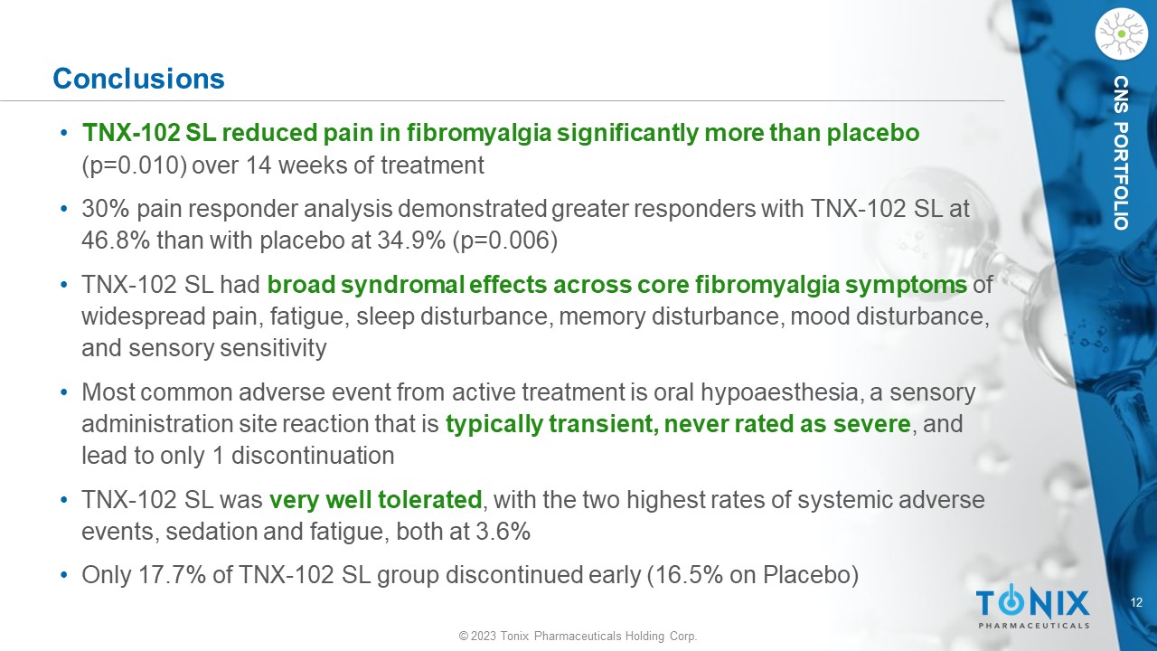 11 © 2023 Tonix Pharmaceuticals Holding Corp. CNS PORTFOLIO Treatment Emergent Adverse Events (TEAEs) • Well tolerated: only systemic TEAE that occurred at a rate of ≥3.0% in either arm was somnolence, sedation, and dry mouth in the TNX - 102 SL arm • Consistent with known side effects of marketed oral cyclobenzaprine Total (N=503) Placebo (N=255) TNX - 102 SL (N=248) % N % N % N Systemic Adverse Events 2.0 10 0.4 1 3.6 9 Sedation 2.6 13 1.6 4 3.6 9 Fatigue 3.0 15 2.7 7 3.2 8 Dry Mouth % N % N % N Administration Site Reactions 8.7 44 0.4 1 17.3 43 Hypoaesthesia oral 3.0 15 0.4 1 5.6 14 Paraesthesia oral 2.4 12 0.4 1 4.4 11 Product taste abnormal 2.2 11 0.8 2 3.6 9 Glossodynia