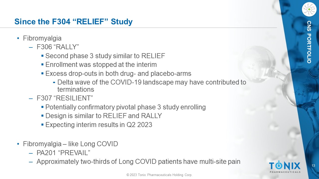 12 © 2023 Tonix Pharmaceuticals Holding Corp. CNS PORTFOLIO Conclusions • TNX - 102 SL reduced pain in fibromyalgia significantly more than placebo (p=0.010) over 14 weeks of treatment • 30% pain responder analysis demonstrated greater responders with TNX - 102 SL at 46.8% than with placebo at 34.9% (p=0.006) • TNX - 102 SL had broad syndromal effects across core fibromyalgia symptoms of widespread pain, fatigue, sleep disturbance, memory disturbance, mood disturbance, and sensory sensitivity • Most common adverse event from active treatment is oral hypoaesthesia, a sensory administration site reaction that is typically transient, never rated as severe , and lead to only 1 discontinuation • TNX - 102 SL was very well tolerated , with the two highest rates of systemic adverse events, sedation and fatigue, both at 3.6% • Only 17.7% of TNX - 102 SL group discontinued early (16.5% on Placebo)