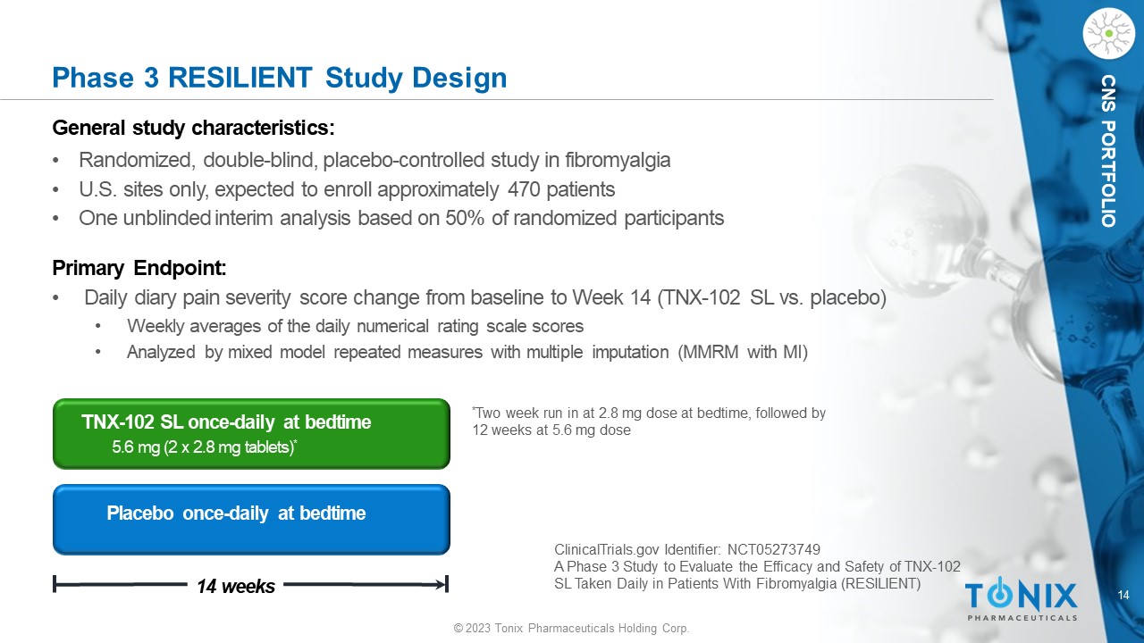 13 © 2023 Tonix Pharmaceuticals Holding Corp. CNS PORTFOLIO Since the F304 “RELIEF” Study • Fibromyalgia ‒ F306 “RALLY” ▪ Second phase 3 study similar to RELIEF ▪ Enrollment was stopped at the interim ▪ Excess drop - outs in both drug - and placebo - arms ⁃ Delta wave of the COVID - 19 landscape may have contributed to terminations ‒ F307 “RESILIENT” ▪ Potentially confirmatory pivotal phase 3 study enrolling ▪ Design is similar to RELIEF and RALLY ▪ Expecting interim results in Q2 2023 • Fibromyalgia – like Long COVID ‒ PA201 “PREVAIL” ‒ Approximately two - thirds of Long COVID patients have multi - site pain
