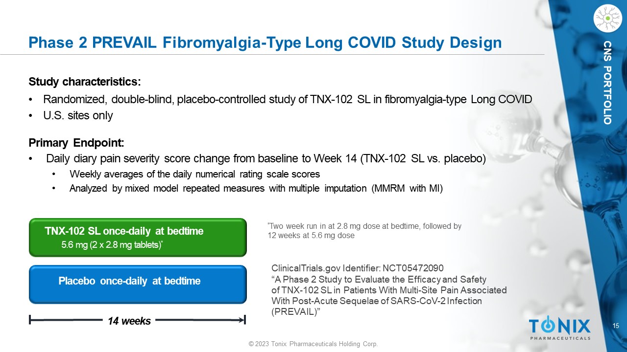 14 © 2023 Tonix Pharmaceuticals Holding Corp. CNS PORTFOLIO Phase 3 RESILIENT Study Design General s tudy c haracteristics: • Randomized, double - blind, placebo - controlle d study in fibromyalgia • U.S. sites only, expected to enroll approximately 470 patients • One unblinded interim analysis based on 50% of randomized participants Primary Endpoint: • Daily diary pain severity score change from baseline to Week 14 (TNX - 102 SL vs. placebo) • Weekly averages of the daily numerical rating scale scores • Analyzed by mixed model repeated measures with multiple imputation (MMRM with MI) Placebo once - daily at bedtime 14 weeks TNX - 102 SL once - daily at bedtime 5.6 mg (2 x 2.8 mg tablets) * * Two week run in at 2.8 mg dose at bedtime, followed by 12 weeks at 5.6 mg dose ClinicalTrials.gov Identifier: NCT05273749 A Phase 3 Study to Evaluate the Efficacy and Safety of TNX - 102 SL Taken Daily in Patients With Fibromyalgia (RESILIENT)