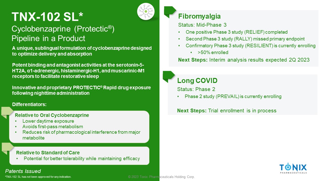 © 2023 Tonix Pharmaceuticals Holding Corp. TNX - 102 SL* Cyclobenzaprine ( Protectic ® ) Pipeline in a Product Fibromyalgia Status: Mid - Phase 3 • One positive Phase 3 study (RELIEF) completed • Second Phase 3 study (RALLY) missed primary endpoint • Confirmatory Phase 3 study (RESILIENT) is currently enrolling • >50% enrolled Next Steps: Interim analysis results expected 2Q 2023 Long COVID Status: Phase 2 • Phase 2 study (PREVAIL) is currently enrolling Next Steps: Trial enrollment is in process Patents Issued *TNX - 102 SL has not been approved for any indication. A unique, sublingual formulation of cyclobenzaprine designed to optimize delivery and absorption Potent binding and antagonist activities at the serotonin - 5 - HT2A, α1 - adrenergic, histaminergic - H1, and muscarinic - M1 receptors to facilitate restorative sleep Innovative and proprietary PROTECTIC ® Rapid drug exposure following nighttime administration Differentiators: Relative to Oral Cyclobenzaprine • Lower daytime exposure • Avoids first - pass metabolism • Reduces risk of pharmacological interference from major metabolite Relative to Standard of Care • Potential for better tolerability while maintaining efficacy