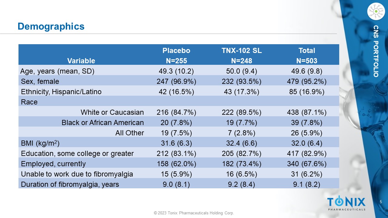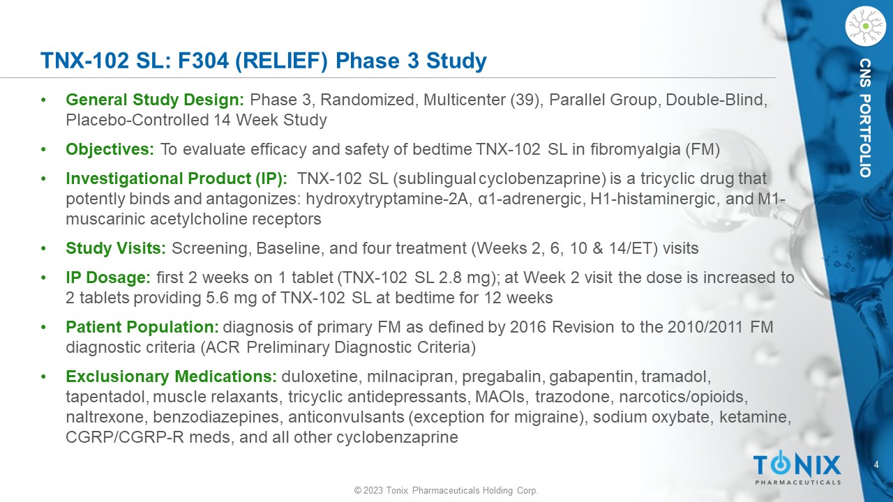 4 © 2023 Tonix Pharmaceuticals Holding Corp. CNS PORTFOLIO TNX - 102 SL: F304 (RELIEF) Phase 3 Study • General Study Design: Phase 3, Randomized, Multicenter (39), Parallel Group, Double - Blind, Placebo - Controlled 14 Week Study • Objectives: To evaluate efficacy and safety of bedtime TNX - 102 SL in fibromyalgia (FM) • Investigational Product (IP): TNX - 102 SL (sublingual cyclobenzaprine) is a tricyclic drug that potently binds and antagonizes: hydroxytryptamine - 2A, α1 - adrenergic, H1 - histaminergic, and M1 - muscarinic acetylcholine receptors • Study Visits: Screening, Baseline, and four treatment (Weeks 2, 6, 10 & 14/ET) visits • IP Dosage: first 2 weeks on 1 tablet (TNX - 102 SL 2.8 mg); at Week 2 visit the dose is increased to 2 tablets providing 5.6 mg of TNX - 102 SL at bedtime for 12 weeks • Patient Population: diagnosis of primary FM as defined by 2016 Revision to the 2010/2011 FM diagnostic criteria (ACR Preliminary Diagnostic Criteria) • Exclusionary Medications: duloxetine, milnacipran, pregabalin, gabapentin, tramadol, tapentadol, muscle relaxants, tricyclic antidepressants, MAOIs, trazodone, narcotics/opioids, naltrexone, benzodiazepines, anticonvulsants (exception for migraine), sodium oxybate, ketamine, CGRP/CGRP - R meds, and all other cyclobenzaprine