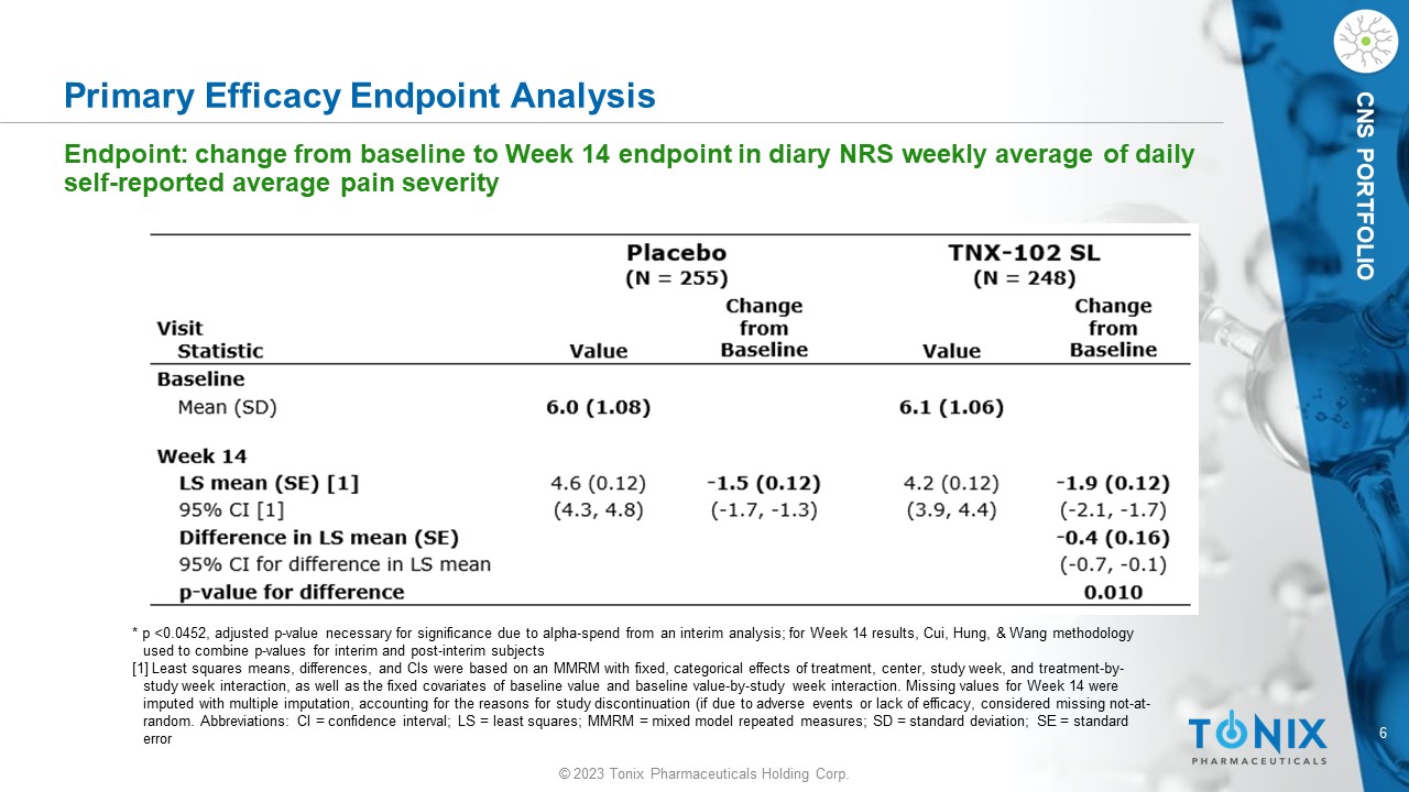 5 © 2023 Tonix Pharmaceuticals Holding Corp. CNS PORTFOLIO Demographics Total TNX - 102 SL Placebo N=503 N=248 N=255 Variable 49.6 (9.8) 50.0 (9.4) 49.3 (10.2) Age, years (mean, SD) 479 (95.2%) 232 (93.5%) 247 (96.9%) Sex, female 85 (16.9%) 43 (17.3%) 42 (16.5%) Ethnicity, Hispanic/Latino Race 438 (87.1%) 222 (89.5%) 216 (84.7%) White or Caucasian 39 (7.8%) 19 (7.7%) 20 (7.8%) Black or African American 26 (5.9%) 7 (2.8%) 19 (7.5%) All Other 32.0 (6.4) 32.4 (6.6) 31.6 (6.3) BMI (kg/m 2 ) 417 (82.9%) 205 (82.7%) 212 (83.1%) Education, some college or greater 340 (67.6%) 182 (73.4%) 158 (62.0%) Employed, currently 31 (6.2%) 16 (6.5%) 15 (5.9%) Unable to work due to fibromyalgia 9.1 (8.2) 9.2 (8.4) 9.0 (8.1) Duration of fibromyalgia, years