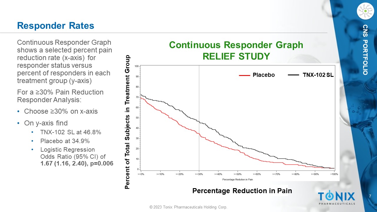 6 © 2023 Tonix Pharmaceuticals Holding Corp. CNS PORTFOLIO Primary Efficacy Endpoint Analysis Endpoint: change from baseline to Week 14 endpoint in diary NRS weekly average of daily self - reported average pain severity * p <0.0452, adjusted p - value necessary for significance due to alpha - spend from an interim analysis; for Week 14 results, Cui, Hun g, & Wang methodology used to combine p - values for interim and post - interim subjects [1] Least squares means, differences, and CIs were based on an MMRM with fixed, categorical effects of treatment, center, stu dy week, and treatment - by - study week interaction, as well as the fixed covariates of baseline value and baseline value - by - study week interaction. Missing values for Week 14 were imputed with multiple imputation, accounting for the reasons for study discontinuation (if due to adverse events or lack of efficacy, considered missing not - at - random. Abbreviations: CI = confidence interval; LS = least squares; MMRM = mixed model repeated measures; SD = standard devi ati on; SE = standard error