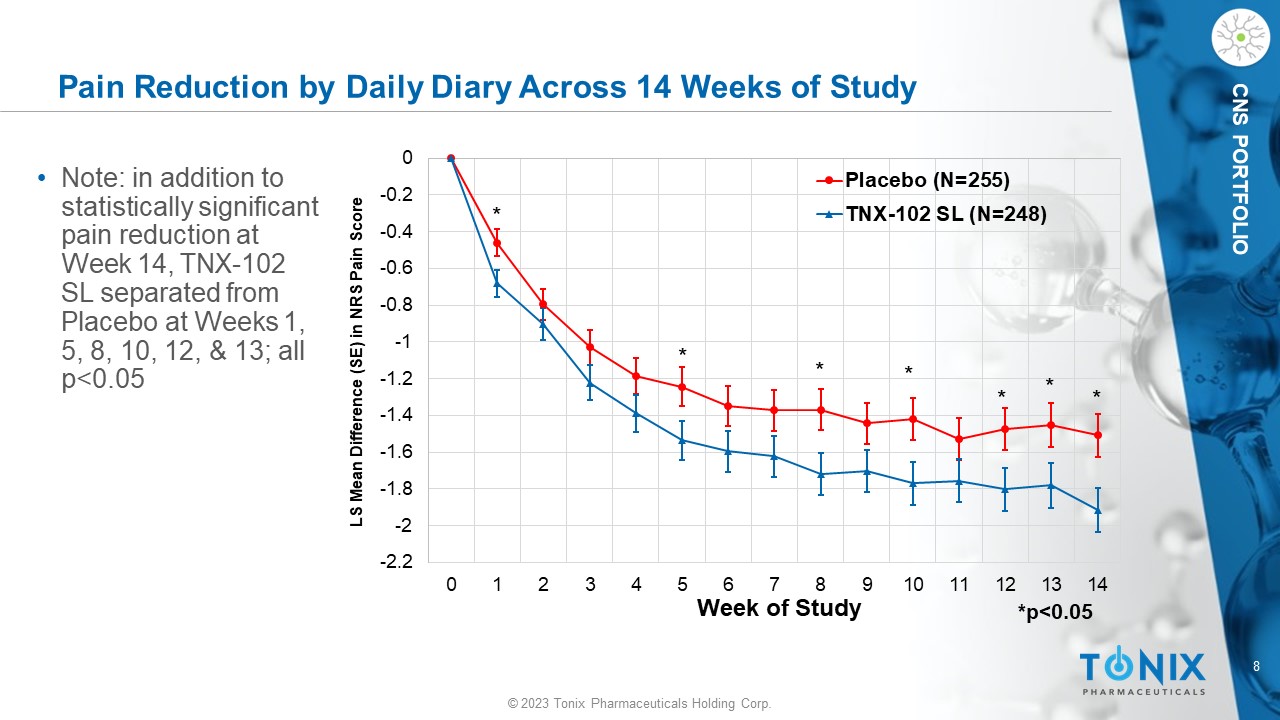7 © 2023 Tonix Pharmaceuticals Holding Corp. CNS PORTFOLIO Responder Rates Continuous Responder Graph shows a selected percent pain reduction rate (x - axis) for responder status versus percent of responders in each treatment group (y - axis) For a ≥30% Pain Reduction Responder Analysis: • Choose ≥30% on x - axis • On y - axis find • TNX - 102 SL at 46.8% • Placebo at 34.9% • Logistic Regression Odds Ratio (95% CI) of 1.67 (1.16, 2.40), p=0.006 Continuous Responder Graph RELIEF STUDY Placebo TNX - 102 SL Percent of Total Subjects in Treatment Group Percentage Reduction in Pain