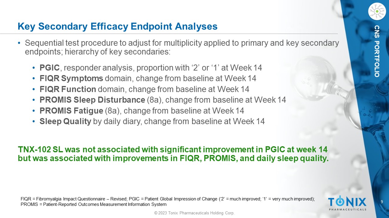 8 © 2023 Tonix Pharmaceuticals Holding Corp. CNS PORTFOLIO Pain Reduction by Daily Diary Across 14 Weeks of Study • Note: in addition to statistically significant pain reduction at Week 14, TNX - 102 SL separated from Placebo at Weeks 1, 5, 8, 10, 12, & 13; all p<0.05 -2.2 -2 -1.8 -1.6 -1.4 -1.2 -1 -0.8 -0.6 -0.4 -0.2 0 0 1 2 3 4 5 6 7 8 9 10 11 12 13 14 LS Mean Difference (SE) in NRS Pain Score Week of Study Placebo (N=255) TNX-102 SL (N=248) * * * * * * * *p<0.05