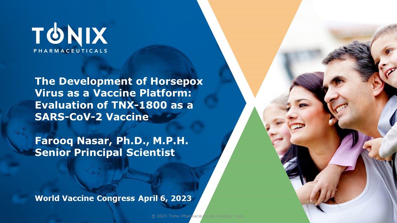 The Development of Horsepox Virus as a Vaccine Platform: Evaluation of TNX - 1800 as a SARS - CoV - 2 Vaccine Farooq Nasar, Ph.D., M.P.H. Senior Principal Scientist World Vaccine Congress April 6, 2023 © 2023 Tonix Pharmaceuticals Holding Corp.
