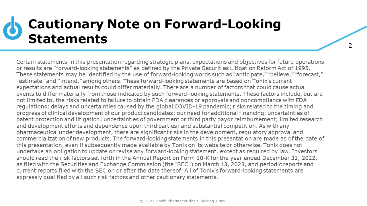 2 © 2023 Tonix Pharmaceuticals Holding Corp. Cautionary Note on Forward - Looking Statements Certain statements in this presentation regarding strategic plans, expectations and objectives for future operations or results are “forward - looking statements” as defined by the Private Securities Litigation Reform Act of 1995. These statements may be identified by the use of forward - looking words such as “anticipate,” “believe,” “forecast,” “estimate” and “intend,” among others. These forward - looking statements are based on Tonix’s current expectations and actual results could differ materially. There are a number of factors that could cause actual events to differ materially from those indicated by such forward - looking statements. These factors include, but are not limited to, the risks related to failure to obtain FDA clearances or approvals and noncompliance with FDA regulations; delays and uncertainties caused by the global COVID - 19 pandemic; risks related to the timing and progress of clinical development of our product candidates; our need for additional financing; uncertainties of patent protection and litigation; uncertainties of government or third party payor reimbursement; limited research and development efforts and dependence upon third parties; and substantial competition. As with any pharmaceutical under development, there are significant risks in the development, regulatory approval and commercialization of new products. The forward - looking statements in this presentation are made as of the date of this presentation, even if subsequently made available by Tonix on its website or otherwise. Tonix does not undertake an obligation to update or revise any forward - looking statement, except as required by law. Investors should read the risk factors set forth in the Annual Report on Form 10 - K for the year ended December 31, 2022, as filed with the Securities and Exchange Commission (the “SEC”) on March 13, 2023, and periodic reports and current reports filed with the SEC on or after the date thereof. All of Tonix's forward - looking statements are expressly qualified by all such risk factors and other cautionary statements.
