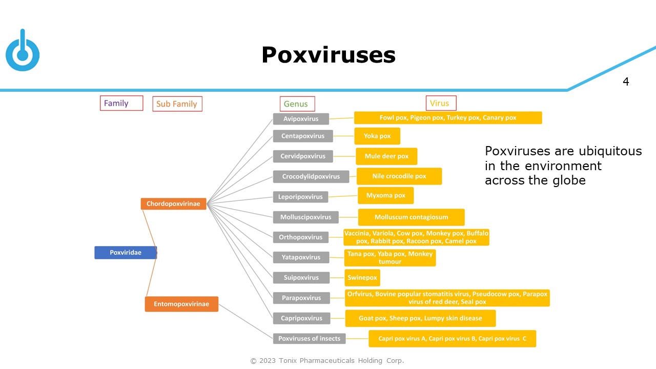 3 © 2023 Tonix Pharmaceuticals Holding Corp. Poxviruses • Family: Poxviridae • Two subfamilies: 1) Chordopoxvirinae 2) Entomopoxvirinae • 22 Genera • Double stranded DNA, enveloped,  128 - 380kb • Virions: brick - shaped,  250 x 350 nm • Infect vertebrate and invertebrate hosts