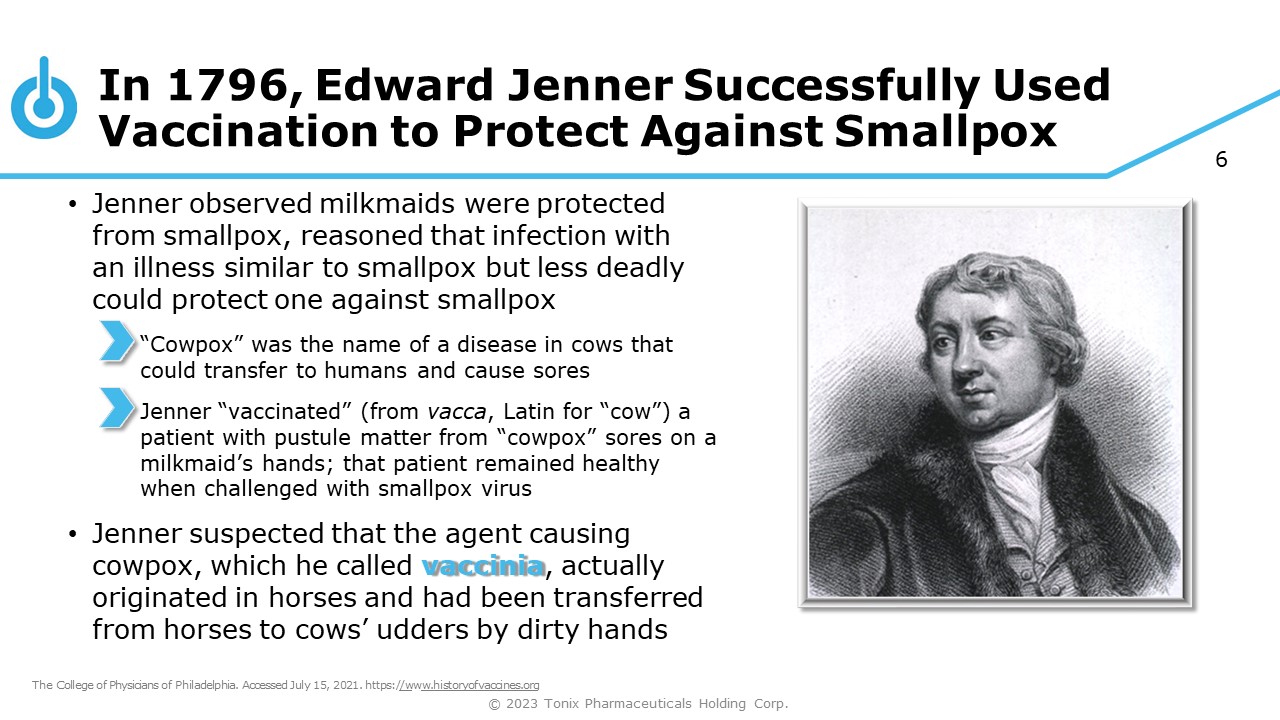 6 In 1796, Edward Jenner Successfully Used Vaccination to Protect Against Smallpox • Jenner observed milkmaids were protected from smallpox, reasoned that infection with an illness similar to smallpox but less deadly could protect one against smallpox “Cowpox” was the name of a disease in cows that could transfer to humans and cause sores Jenner “vaccinated” (from vacca , Latin for “cow”) a patient with pustule matter from “cowpox” sores on a milkmaid’s hands; that patient remained healthy when challenged with smallpox virus • Jenner suspected that the agent causing cowpox, which he called vaccinia , actually originated in horses and had been transferred from horses to cows’ udders by dirty hands The College of Physicians of Philadelphia. Accessed July 15, 2021. https:/ /w w w.historyofvaccines.org © 2023 Tonix Pharmaceuticals Holding Corp.