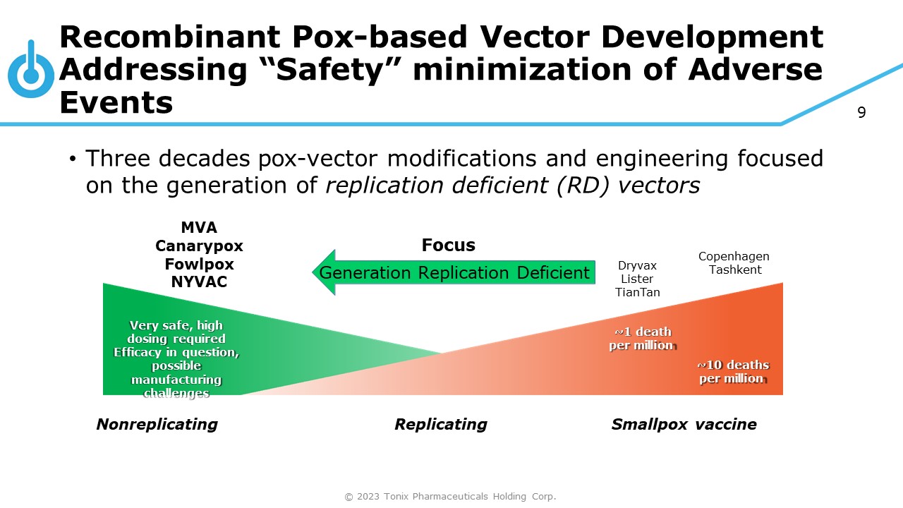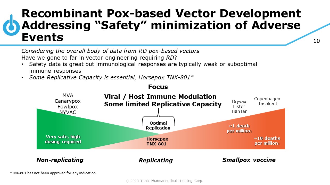 9 Recombinant Pox - based Vector Development Addressing “Safety” minimization of Adverse Events Very safe, high dosing required Efficacy in question, possible manufacturing challenges ~1 death per million ~10 deaths per million Nonreplicating © 2023 Tonix Pharmaceuticals Holding Corp. Replicating Smallpox vaccine Dryvax Lister TianTan Copenhagen Tashkent • Three decades pox - vector modifications and engineering focused on the generation of replication deficient (RD) vectors MVA Canarypox Fowlpox NYVAC Focus Generation Replication Deficient
