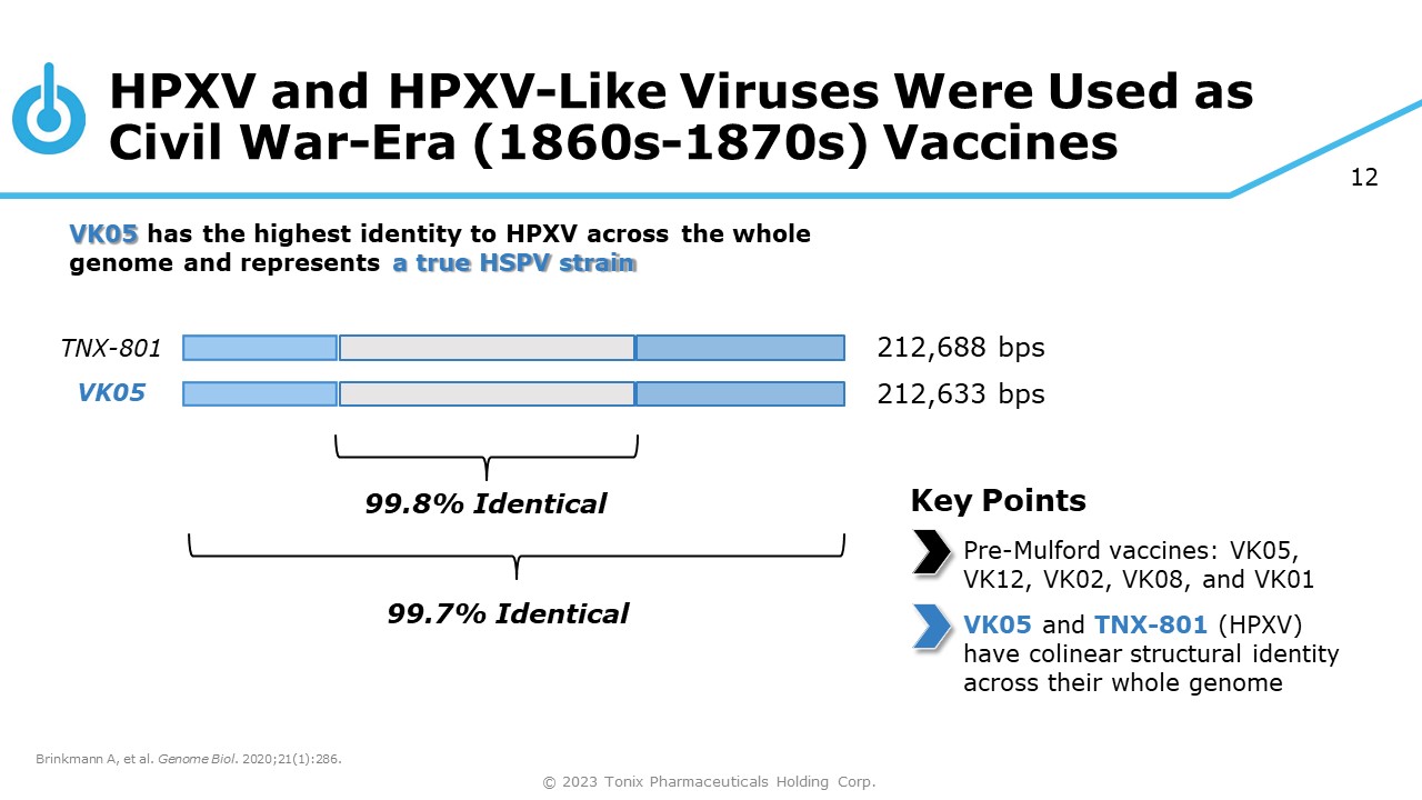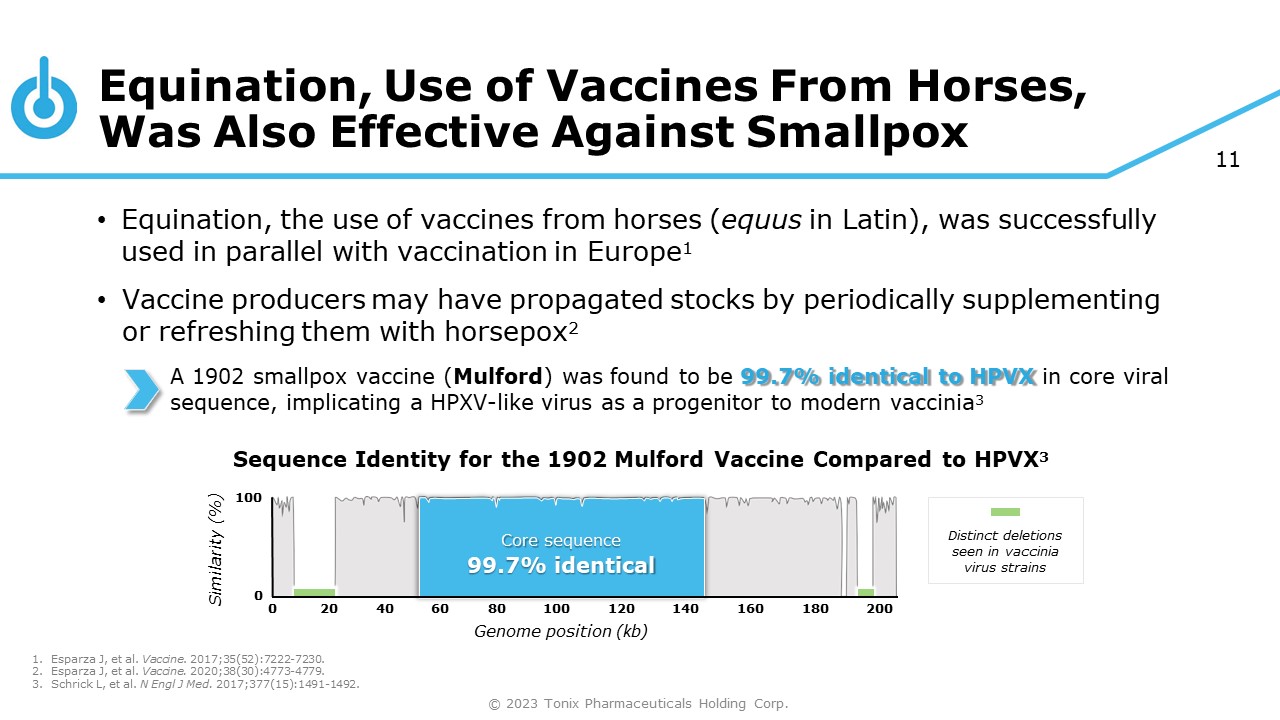 11 Equination, Use of Vaccines From Horses, Was Also Effective Against Smallpox • Equination, the use of vaccines from horses ( equus in Latin), was successfully used in parallel with vaccination in Europe 1 • Vaccine producers may have propagated stocks by periodically supplementing or refreshing them with horsepox 2 A 1902 smallpox vaccine ( Mulford ) was found to be 99.7% identical to HPVX in core viral sequence, implicating a HPXV - like virus as a progenitor to modern vaccinia 3 Sequence Identity for the 1902 Mulford Vaccine Compared to HPVX 3 Similarity (%) 100 20 40 60 Core sequence 99.7% identical 80 100 120 Genome position (kb) 140 160 180 200 0 0 Distinct deletions seen in vaccinia virus strains 1. Esparza J, et al. Vaccine . 2017;35(52):7222 - 7230. 2. Esparza J, et al. Vaccine. 2020;38(30):4773 - 4779. 3. Schrick L, et al. N Engl J Med. 2017;377(15):1491 - 1492. © 2023 Tonix Pharmaceuticals Holding Corp.