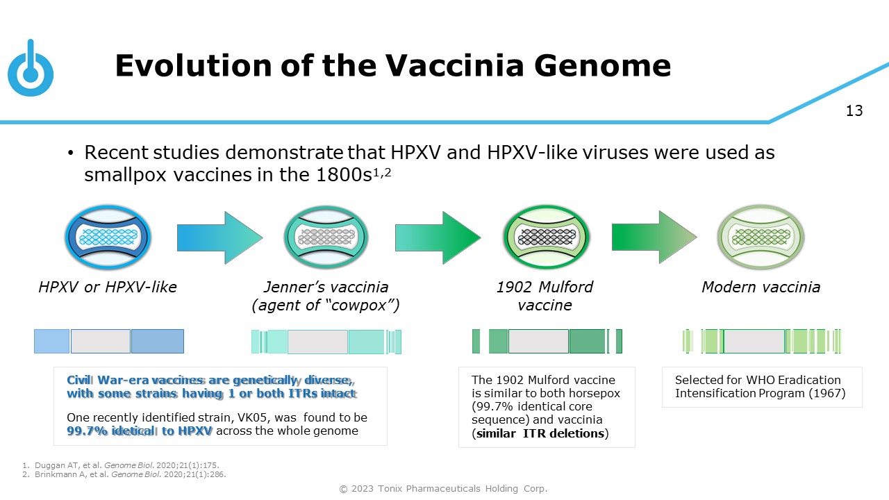 12 HPXV and HPXV - Like Viruses Were Used as Civil War - Era (1860s - 1870s) Vaccines TNX - 801 VK05 VK05 has the highest identity to HPXV across the whole genome and represents a true HSPV strain 99.8% Identical Brinkmann A, et al. Genome Biol . 2020;21(1):286. © 2023 Tonix Pharmaceuticals Holding Corp. 99.7% Identical 212,688 bps 212,633 bps Key Points Pre - Mulford vaccines: VK05, VK12, VK02, VK08, and VK01 VK05 and TNX - 801 (HPXV) have colinear structural identity across their whole genome