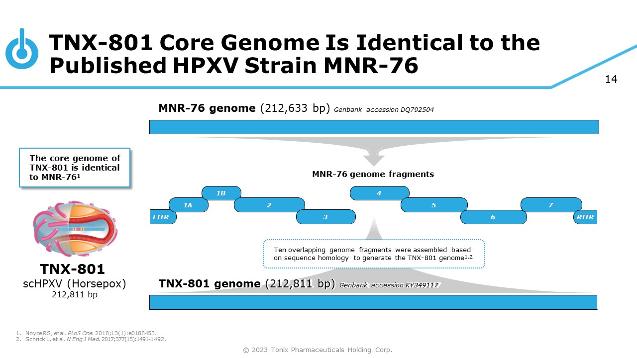 Evolution of the Vaccinia Genome 13 • Recent studies demonstrate that HPXV and HPXV - like viruses were used as smallpox vaccines in the 1800s 1,2 HPXV or HPXV - like Jenner’s vaccinia (agent of “cowpox”) 1902 Mulford vaccine Modern vaccinia The 1902 Mulford vaccine is similar to both horsepox (99.7% identical core sequence) and vaccinia ( similar ITR deletions ) Selected for WHO Eradication Intensification Program (1967) Civil War - era vaccines are genetically diverse, with some strains having 1 or both ITRs intact One recently identified strain, VK05, was found to be 99.7% idetical to HPXV across the whole genome 2. Brinkmann A, et al. Genome Biol. 2020;21(1):286. © 2023 Tonix Pharmaceuticals Holding Corp. 1. Duggan AT, et al. Genome Biol. 2020;21(1):175.