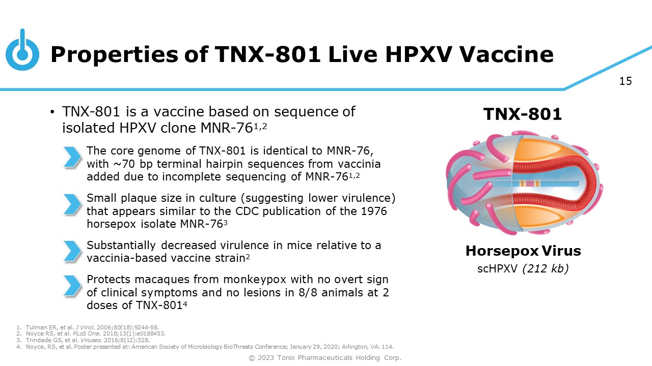 14 TNX - 801 Core Genome Is Identical to the Published HPXV Strain MNR - 76 1. Noyce RS, et al. PLoS One. 2018;13(1):e0188453. 2. Schrick L, et al. N Eng J Med. 2017;377(15):1491 - 1492. TNX - 801 scHPXV (Horsepox) 212,811 bp LITR 1A 1B 4 2 3 5 6 7 RITR MNR - 76 genome fragments MNR - 76 genome (212,633 bp) Genbank accession DQ792504 The core genome of TNX - 801 is identical to MNR - 76 1 TNX - 801 genome (212,811 bp) Genbank accession KY349117 Ten overlapping genome fragments were assembled based on sequence homology to generate the TNX - 801 genome 1,2 © 2023 Tonix Pharmaceuticals Holding Corp.