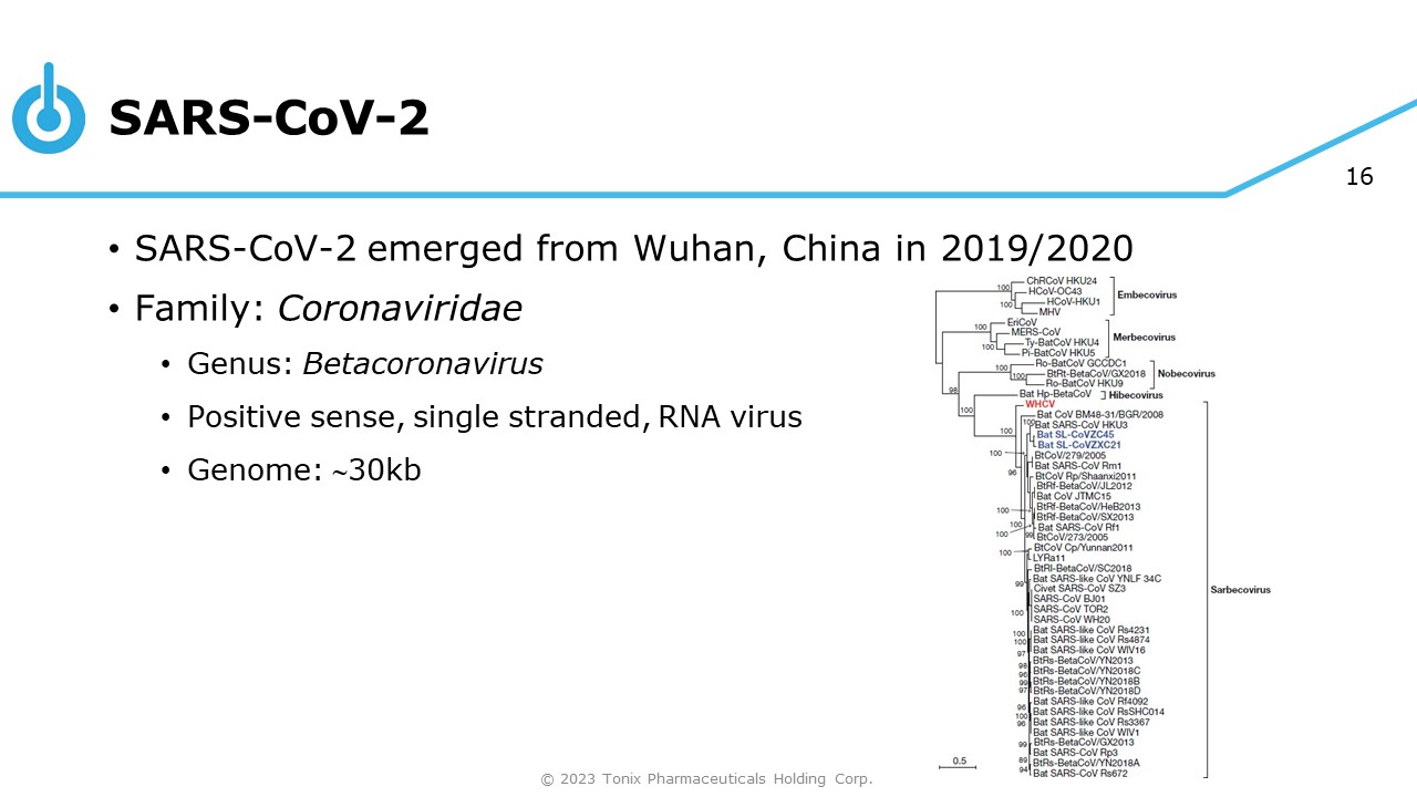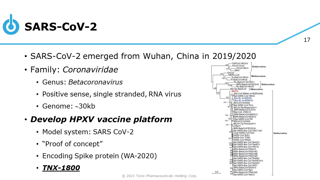 16 SARS - CoV - 2 • SARS - CoV - 2 emerged from Wuhan, China in 2019/2020 • Family: Coronaviridae • Genus: Betacoronavirus • Positive sense, single stranded, RNA virus • Genome:  30kb © 2023 Tonix Pharmaceuticals Holding Corp.