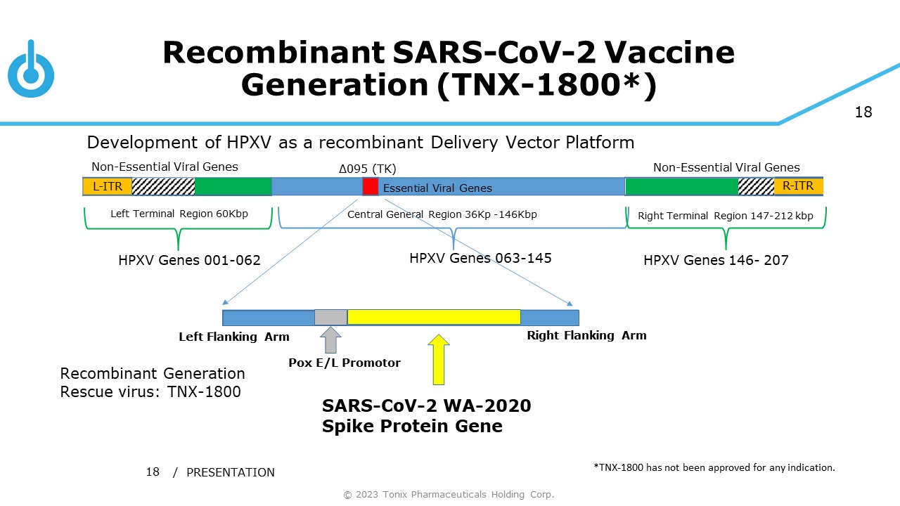 17 SARS - CoV - 2 • SARS - CoV - 2 emerged from Wuhan, China in 2019/2020 • Family: Coronaviridae • Genus: Betacoronavirus • Positive sense, single stranded, RNA virus • Genome:  30kb • Develop HPXV vaccine platform • Model system: SARS CoV - 2 • “Proof of concept” • Encoding Spike protein (WA - 2020) • TNX - 1800 © 2023 Tonix Pharmaceuticals Holding Corp.