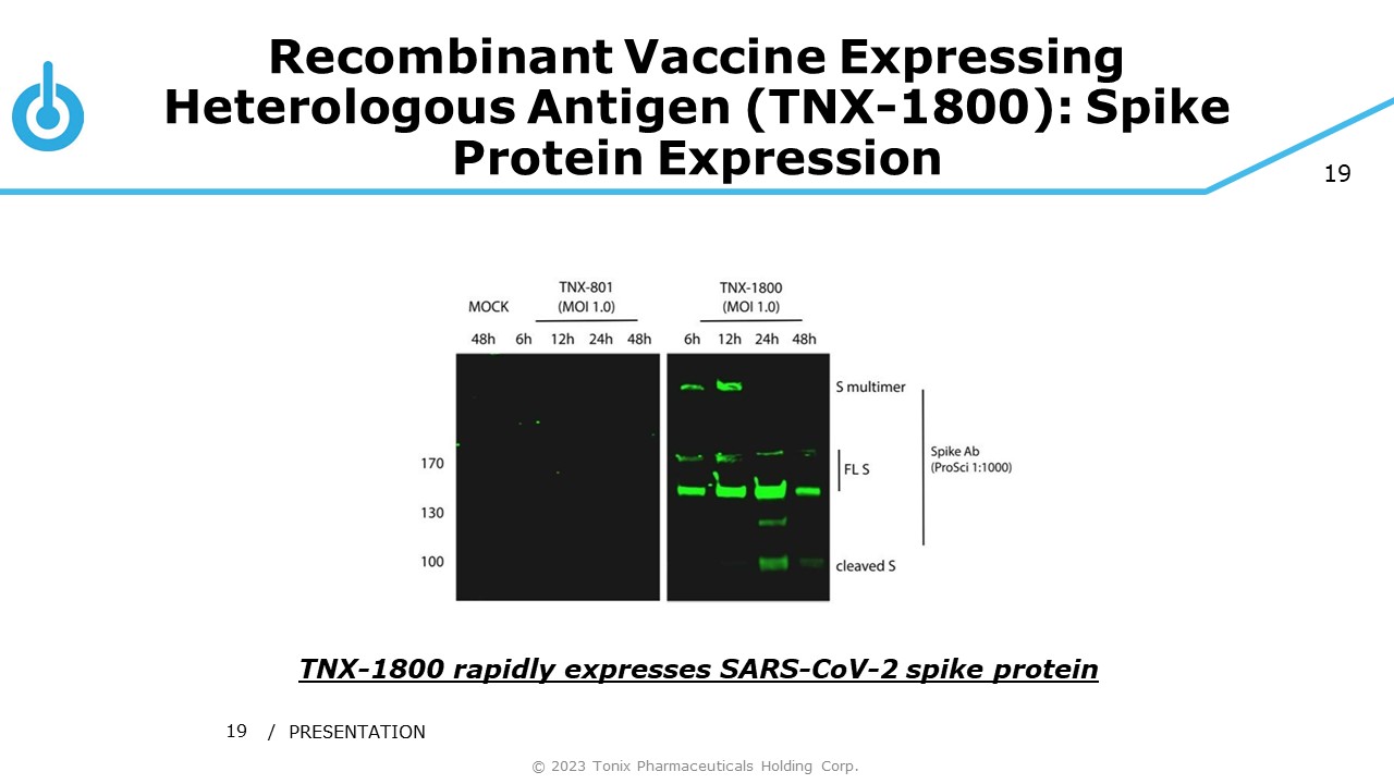 19 Recombinant Vaccine Expressing Heterologous Antigen (TNX - 1800): Spike Protein Expression / PRESENTATION 19 TNX - 1800 rapidly expresses SARS - CoV - 2 spike protein © 2023 Tonix Pharmaceuticals Holding Corp.