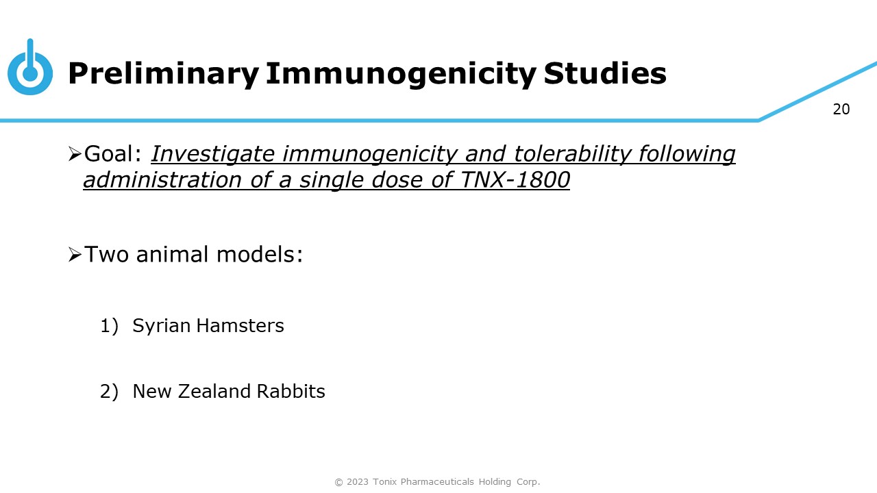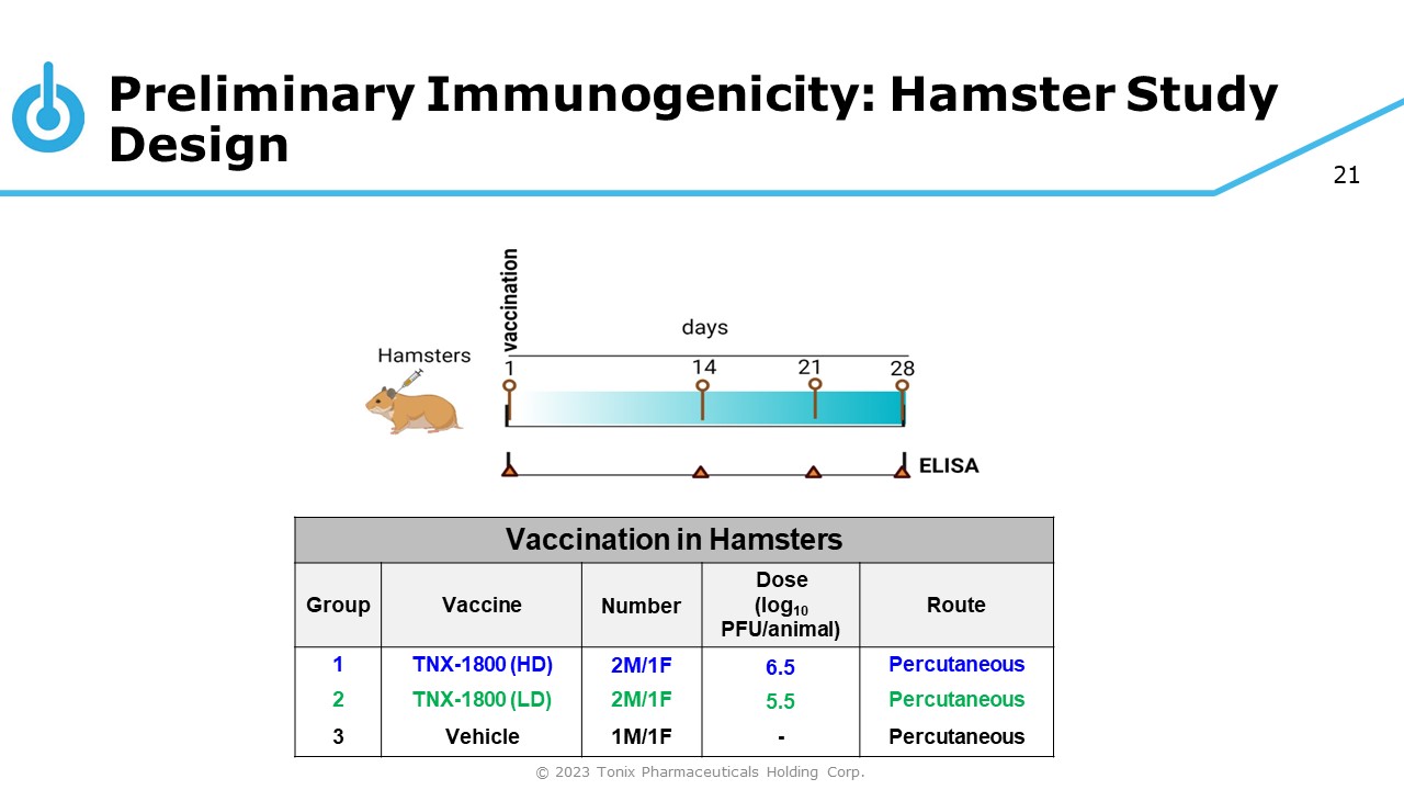 20 Preliminary Immunogenicity Studies © 2023 Tonix Pharmaceuticals Holding Corp. » Goal: Investigate immunogenicity and tolerability following administration of a single dose of TNX - 1800 » Two animal models: 1) Syrian Hamsters 2) New Zealand Rabbits