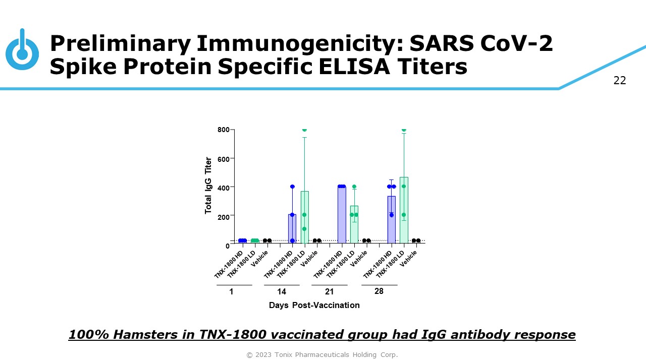 21 Preliminary Immunogenicity: Hamster Study Design Vaccination in Hamsters Group Vaccine Number Dose (log 10 PFU/animal) Route 1 TNX - 1800 (HD) 2M/1F 6.5 Percutaneous 2 TNX - 1800 (LD) 2M/1F 5.5 Percutaneous 3 Vehicle 1M/1F - Percutaneous © 2023 Tonix Pharmaceuticals Holding Corp.