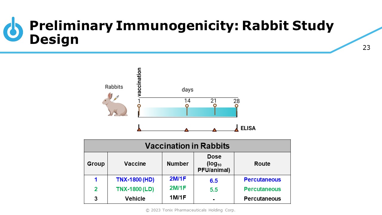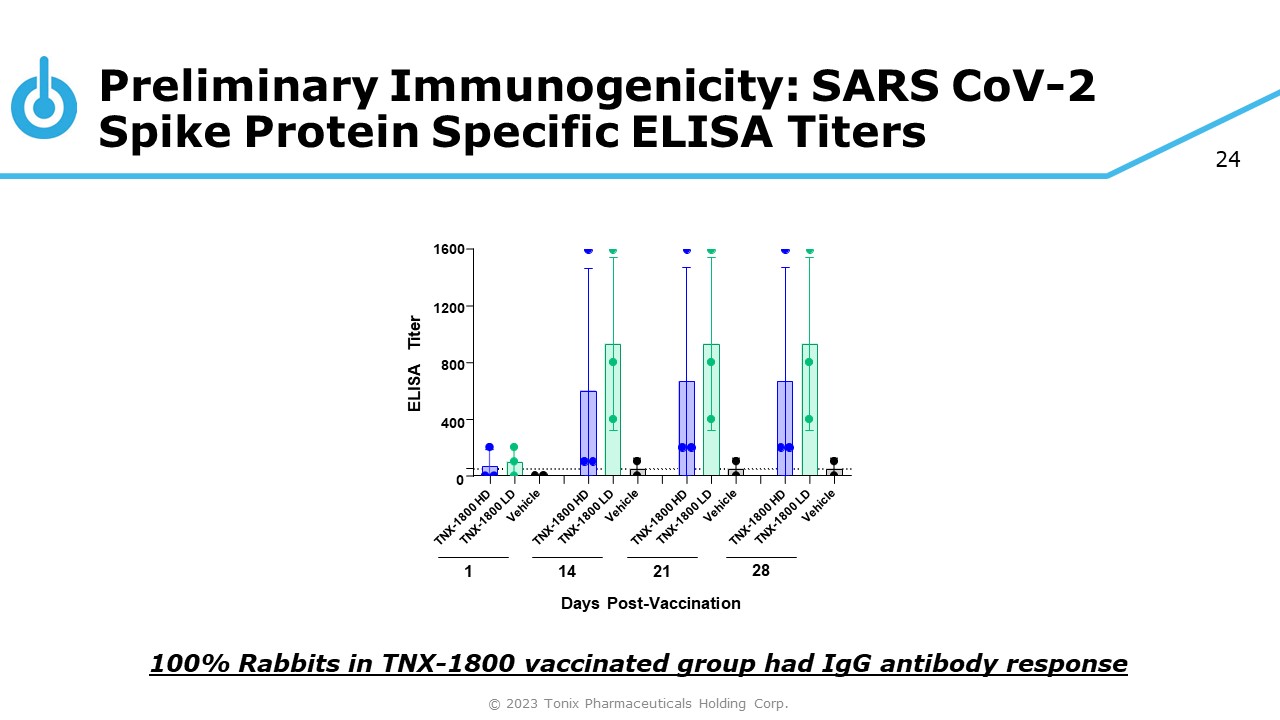 23 Preliminary Immunogenicity: Rabbit Study Design Vaccination in Rabbits Group Vaccine Number Dose (log 10 PFU/animal) Route 1 TNX - 1800 (HD) 2M/1F 6.5 Percutaneous 2 TNX - 1800 (LD) 2M/1F 5.5 Percutaneous 3 Vehicle 1M/1F - Percutaneous © 2023 Tonix Pharmaceuticals Holding Corp.