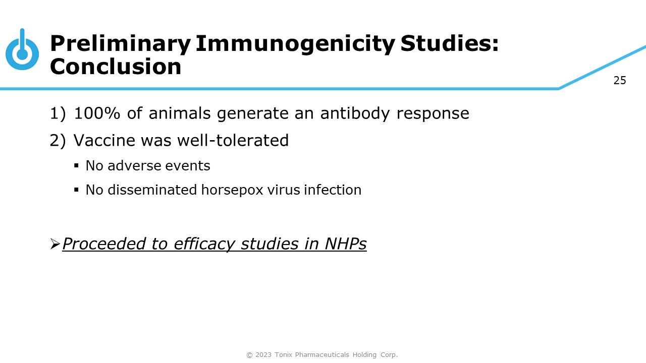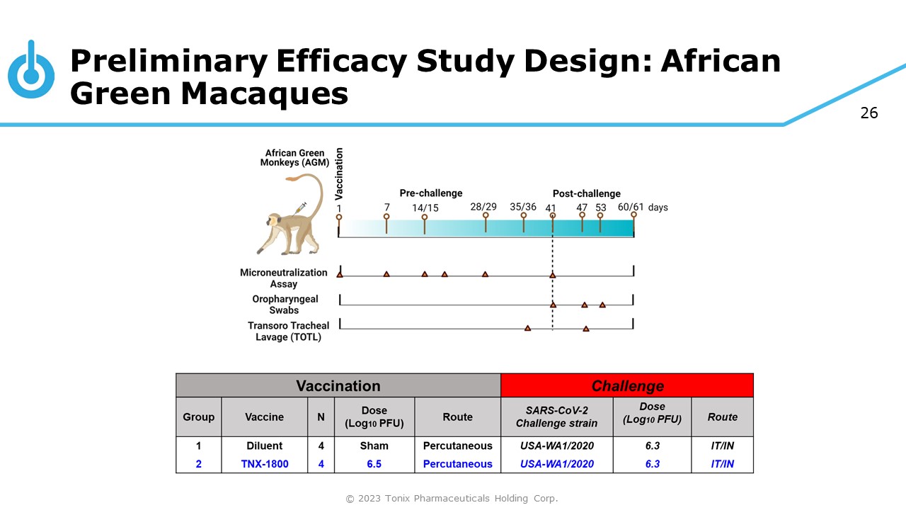 25 Preliminary Immunogenicity Studies: Conclusion © 2023 Tonix Pharmaceuticals Holding Corp. 1) 100% of animals generate an antibody response 2) Vaccine was well - tolerated ▪ No adverse events ▪ No disseminated horsepox virus infection » Proceeded to efficacy studies in NHPs