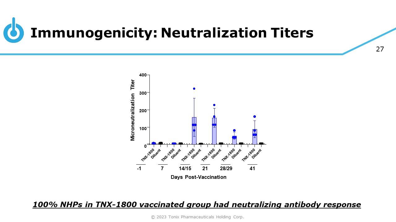 27 400 300 200 100 0 Microneutralization Titer - 1 7 14/15 21 28/29 Days Post - Vaccination 41 Immunogenicity: Neutralization Titers © 2023 Tonix Pharmaceuticals Holding Corp. 100% NHPs in TNX - 1800 vaccinated group had neutralizing antibody response
