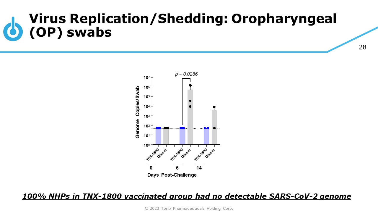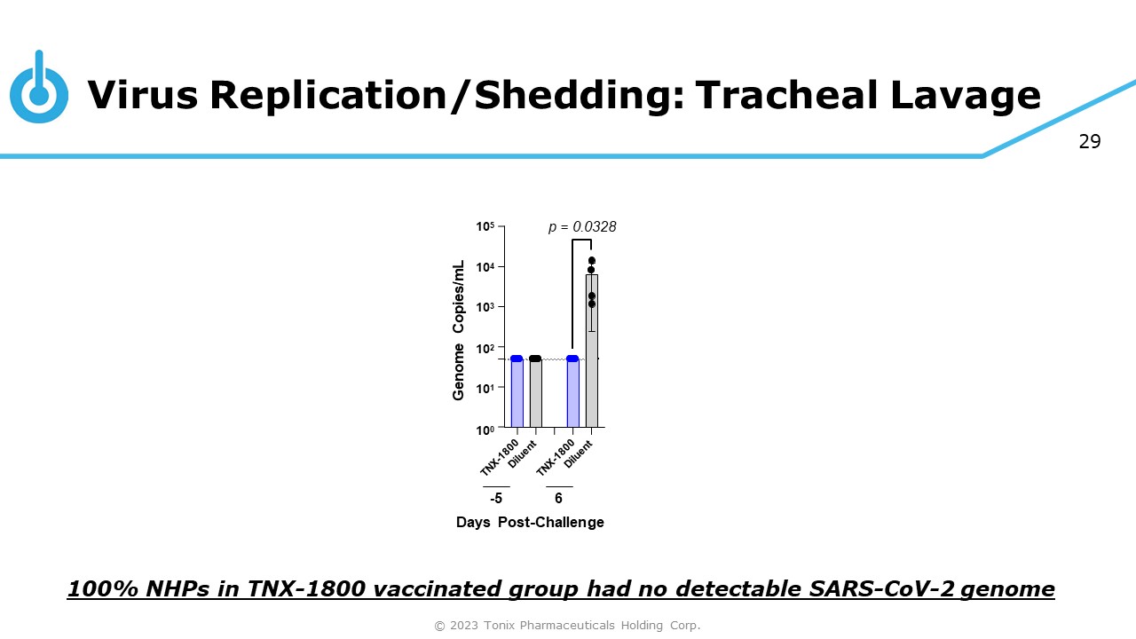 28 Virus Replication/Shedding: Oropharyngeal (OP) swabs 10 6 10 5 10 4 10 3 10 2 10 1 10 0 10 7 Genome Copies/Swab 0 6 14 Days Post - Challenge p = 0.0286 100% NHPs in TNX - 1800 vaccinated group had no detectable SARS - CoV - 2 genome © 2023 Tonix Pharmaceuticals Holding Corp.