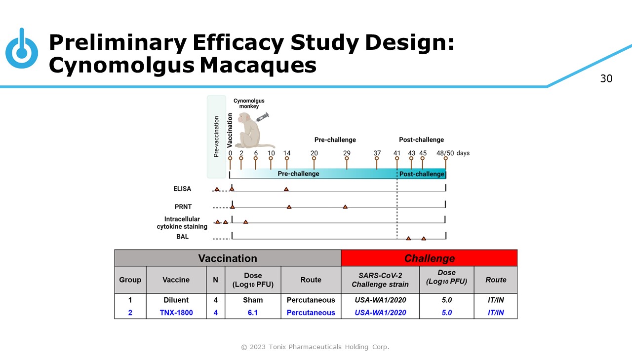 30 Preliminary Efficacy Study Design: Cynomolgus Macaques © 2023 Tonix Pharmaceuticals Holding Corp.
