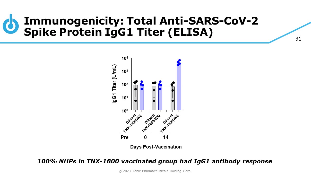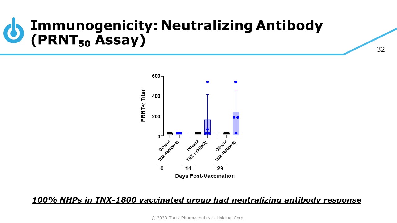 31 Immunogenicity: Total Anti - SARS - CoV - 2 Spike Protein IgG1 Titer (ELISA) 100% NHPs in TNX - 1800 vaccinated group had IgG1 antibody response 10 4 10 3 10 2 10 1 10 0 IgG1 Titer (U/mL) 0 14 Days Post - Vaccination Pre © 2023 Tonix Pharmaceuticals Holding Corp.