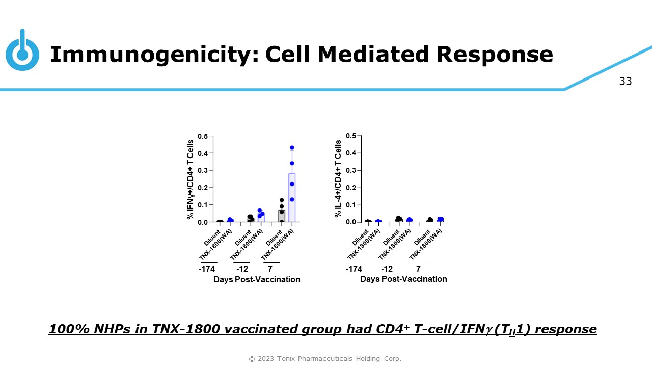 32 Immunogenicity: Neutralizing Antibody (PRNT 50 Assay) 100% NHPs in TNX - 1800 vaccinated group had neutralizing antibody response 600 400 200 0 PRNT 50 Titer 0 14 29 Days Post - Vaccination © 2023 Tonix Pharmaceuticals Holding Corp.