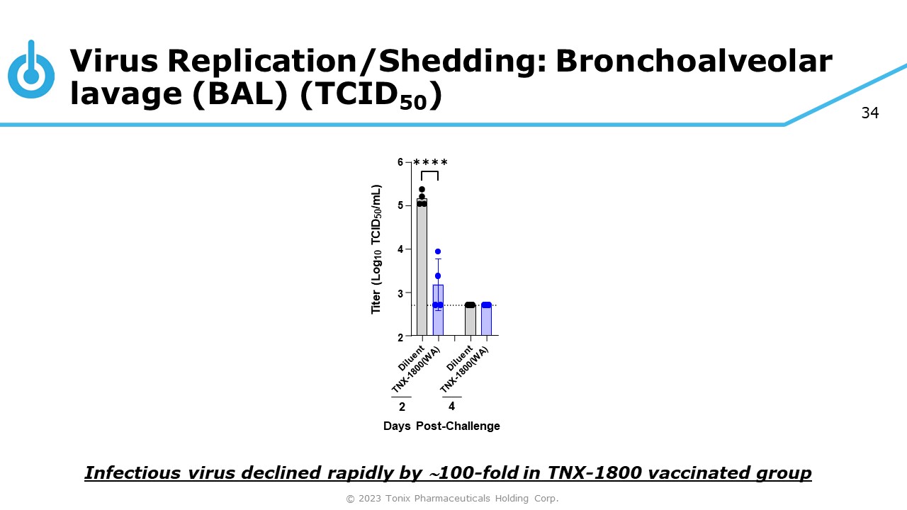 33 0.0 0.1 0.2 0.3 0.4 0.5 %IFNγ+/CD4+ T Cells - 174 - 12 7 Days Post - Vaccination 0.0 0.1 0.2 0.3 0.4 0.5 %IL - 4+/CD4+ T Cells - 174 - 12 7 Days Post - Vaccination Immunogenicity: Cell Mediated Response 100% NHPs in TNX - 1800 vaccinated group had CD4 + T - cell/IFN  (T H 1) response © 2023 Tonix Pharmaceuticals Holding Corp.