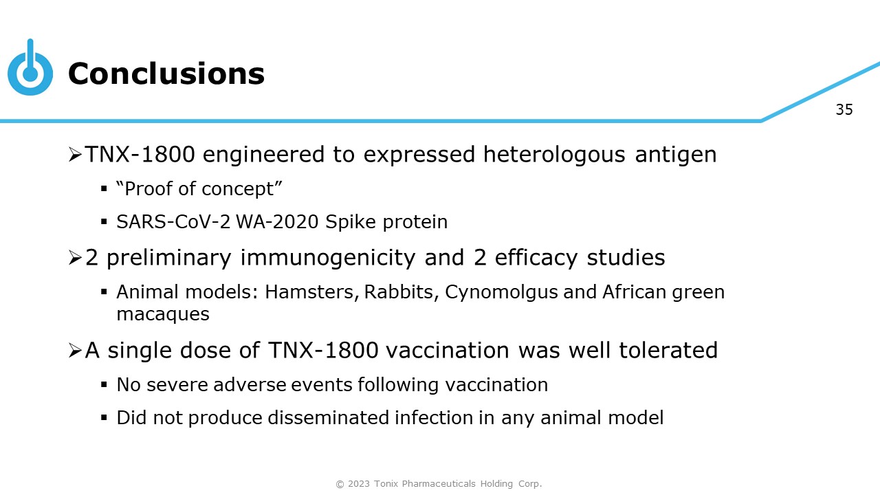 34 Virus Replication/Shedding: Bronchoalveolar lavage (BAL) (TCID 50 ) 5 4 3 2 6 Titer (Log 10 TCID 50 /mL) 2 4 Days Post - Challenge Infectious virus declined rapidly by  100 - fold in TNX - 1800 vaccinated group ٓٓٓٓ © 2023 Tonix Pharmaceuticals Holding Corp.