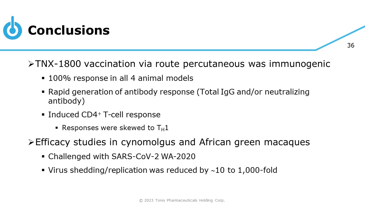 35 Conclusions © 2023 Tonix Pharmaceuticals Holding Corp. » TNX - 1800 engineered to expressed heterologous antigen ▪ “Proof of concept” ▪ SARS - CoV - 2 WA - 2020 Spike protein » 2 preliminary immunogenicity and 2 efficacy studies ▪ Animal models: Hamsters, Rabbits, Cynomolgus and African green macaques » A single dose of TNX - 1800 vaccination was well tolerated ▪ No severe adverse events following vaccination ▪ Did not produce disseminated infection in any animal model