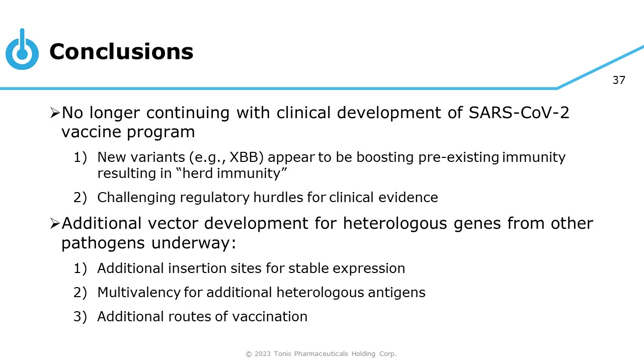Conclusions © 2023 Tonix Pharmaceuticals Holding Corp. 36 » TNX - 1800 vaccination via route percutaneous was immunogenic ▪ 100% response in all 4 animal models ▪ Rapid generation of antibody response (Total IgG and/or neutralizing antibody) ▪ Induced CD4 + T - cell response ▪ Responses were skewed to T H 1 » Efficacy studies in cynomolgus and African green macaques ▪ Challenged with SARS - CoV - 2 WA - 2020 ▪ Virus shedding/replication was reduced by  10 to 1,000 - fold