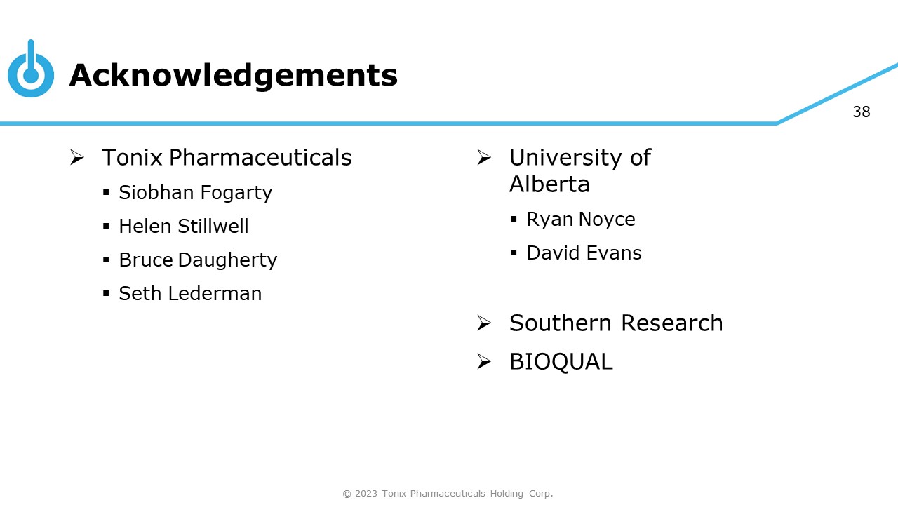 38 » Tonix Pharmaceuticals ▪ Siobhan Fogarty ▪ Helen Stillwell ▪ Bruce Daugherty ▪ Seth Lederman Acknowledgements © 2023 Tonix Pharmaceuticals Holding Corp. » University of Alberta ▪ Ryan Noyce ▪ David Evans » Southern Research » BIOQUAL