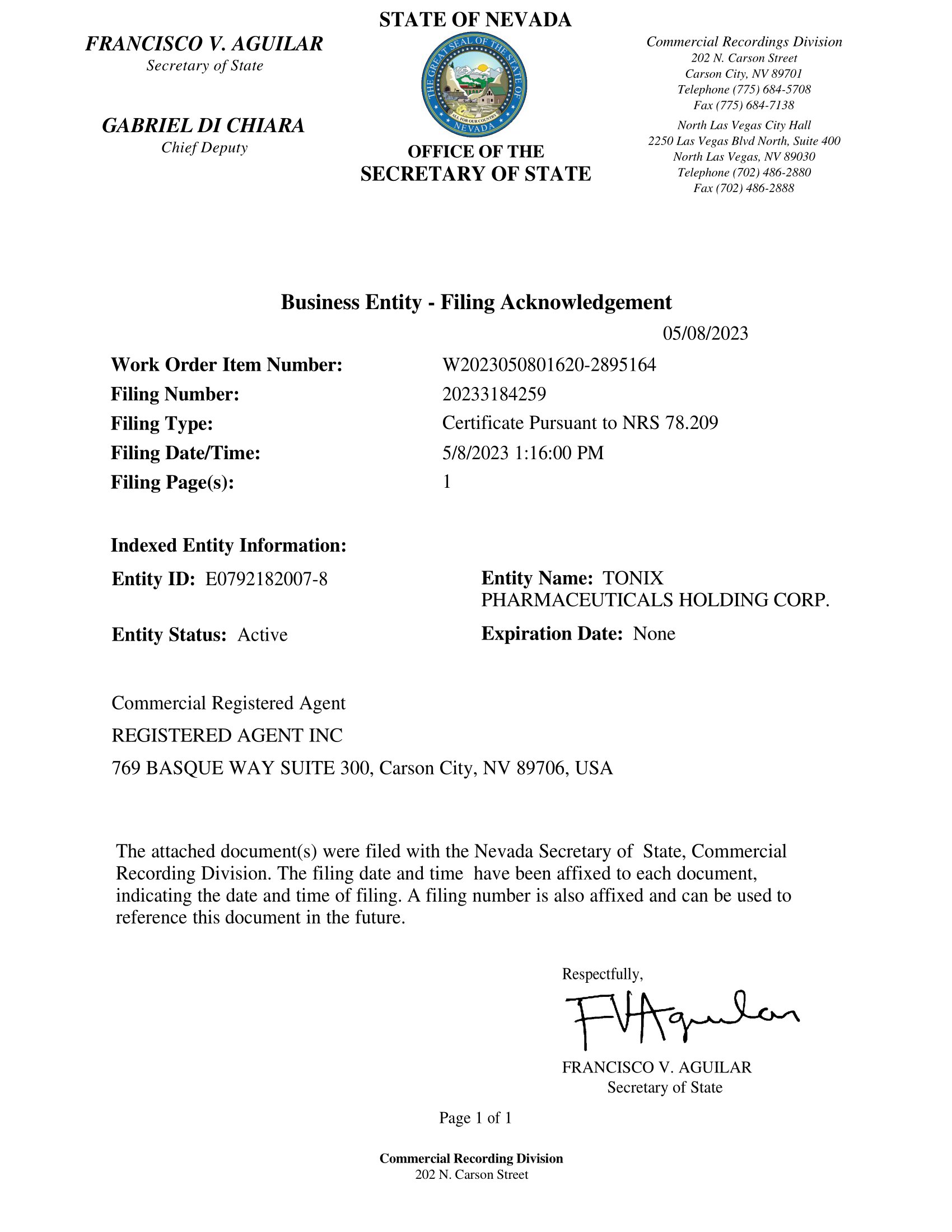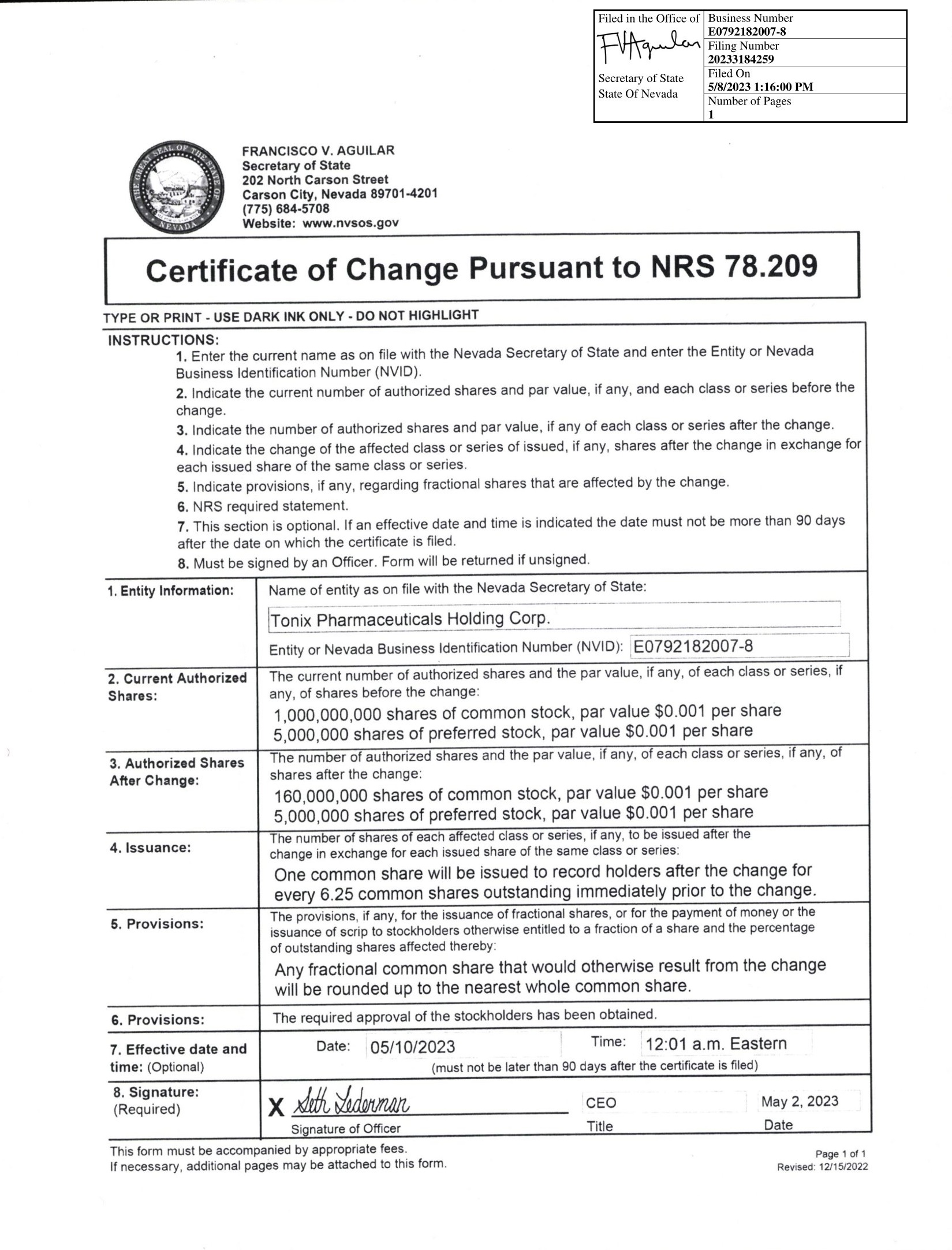 EX-3.01 2 ex3-01.htm CERTIFICATE OF CHANGE OF TONIX PHARMACEUTICALS HOLDING CORP., DATED MAY 8, 2023 AND EFFECTIVE MAY 10, 2023