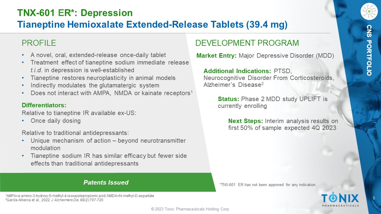 © 2023 Tonix Pharmaceuticals Holding Corp. 4 © 2023 Tonix Pharmaceuticals Holding Corp. CNS PORTFOLIO • The Sequenced Treatment Alternatives to Relieve Depression (STAR*D) study, regarded as the largest antidepressant trial ever conducted, indicated approximately 30% of depressed patients fail to achieve remission , even after multiple treatment attempts 1,2 • SSRIs are currently the most prescribed class of antidepressants, yet only about 50% of patients with MDD respond to initial SSRI treatment , and only 35 - 40% of those patients achieve full remission 1 • Antidepressant treatments often continue for years, and the side effect profiles of the monoaminergic antidepressants are intolerable to many • There is a high unmet need for new classes of antidepressants with different mechanisms of action High Unmet N eed for New C lasses of Antidepressants 1 Rush et al., 2006. Am J Psychiatry. 163:1905 – 1917 2 Rush et al., 2004. Control Clin Trials . 25(1):119 - 42