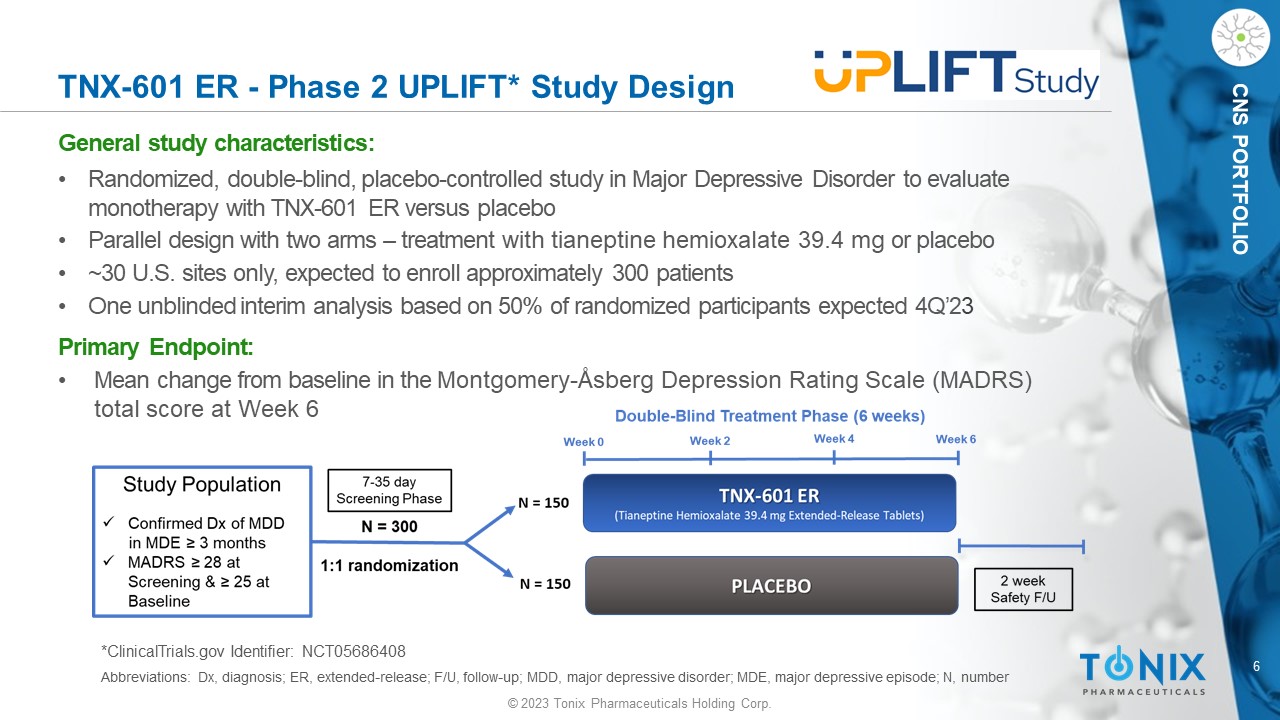 © 2023 Tonix Pharmaceuticals Holding Corp. 5 © 2023 Tonix Pharmaceuticals Holding Corp. CNS PORTFOLIO PROFILE DEVELOPMENT PROGRAM Patents Issued TNX - 601 E R*: Depression Tianeptine Hemioxalate Extended - Release Tablets (39.4 mg) CNS PORTFOLIO • A novel, oral, extended - release once - daily tablet • Treatment effect of tianeptine sodium immediate release t.i.d. in depression is well - established • Tianeptine restores neuroplasticity in animal models • Indirectly modulates the glutamatergic system • Does not interact with AMPA, NMDA or kainate receptors 1 Differentiators: Relative to tianeptine IR available ex - US: • Once daily dosing Relative to traditional antidepressants: • Unique mechanism of action – beyond neurotransmitter modulation • Tianeptine sodium IR has similar efficacy but fewer side effects than traditional antidepressants Market Entry: Major Depressive Disorder (MDD) Additional Indications: PTSD, Neurocognitive Disorder From Corticosteroids, Alzheimer’s Disease 2 Status: Phase 2 MDD study UPLIFT is currently enrolling Next Steps: Interim analysis results on first 50% of sample expected 4Q 2023 1 AMPA= α - amino - 3 - hydroxy - 5 - methyl - 4 - isoxazolepropionic acid; NMDA=N - methyl - D - aspartate 2 García - Alberca et al., 2022. J Alzheimers Dis . 88(2):707 - 720 *TNX - 601 ER has not been approved for any indication.